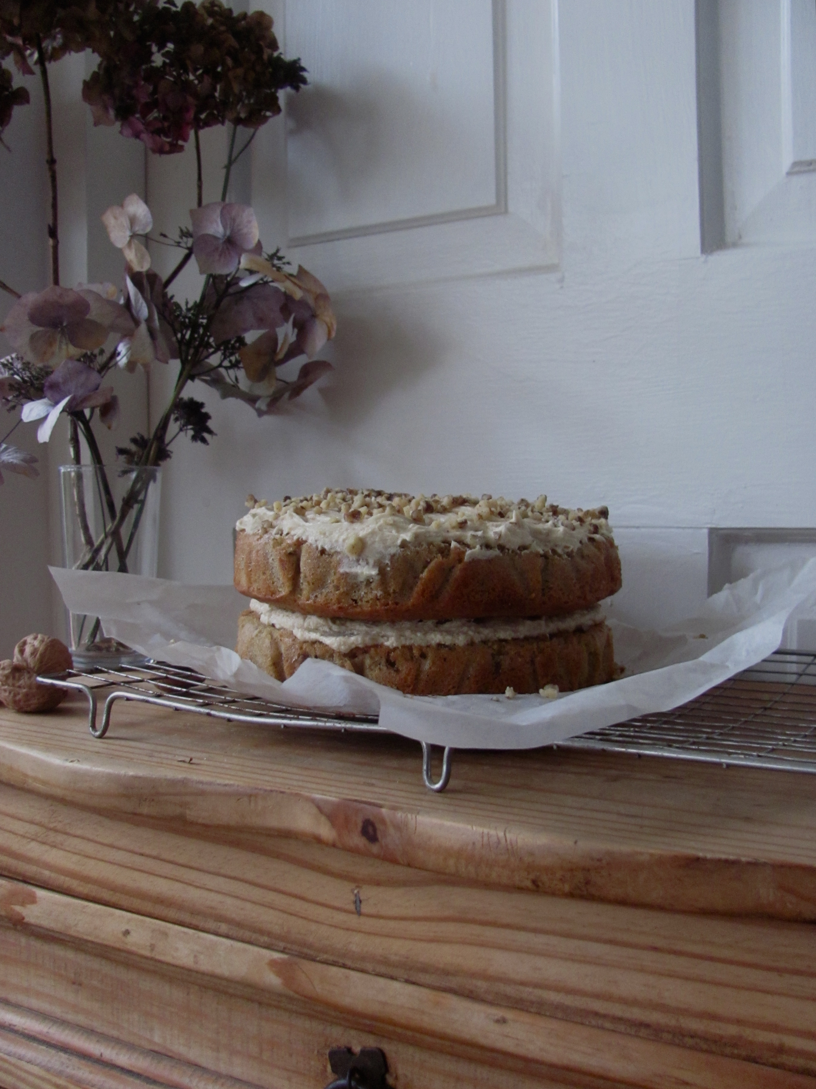 – Preheat the oven to 180 degrees and line two sandwich tins with parchment. In a mixing bowl, beat the butter and sugar together till fluffy and pale. Add the eggs, one by one, incorporating each fully into the mixture before adding the next. Add the espresso and a drop of vanilla extract if desired and mix in fully. Fold in the flour and walnuts. Divide the mixture between two 20cm sandwich tins – mine were smaller than this – and bake for 25-30 minutes, or until golden brown, springy and a skewer comes out clean. Transfer the cakes, still in their tins, to a cooling rack. After 5 minutes, remove from the tins and leave on the cooling racks till they are fully cool.