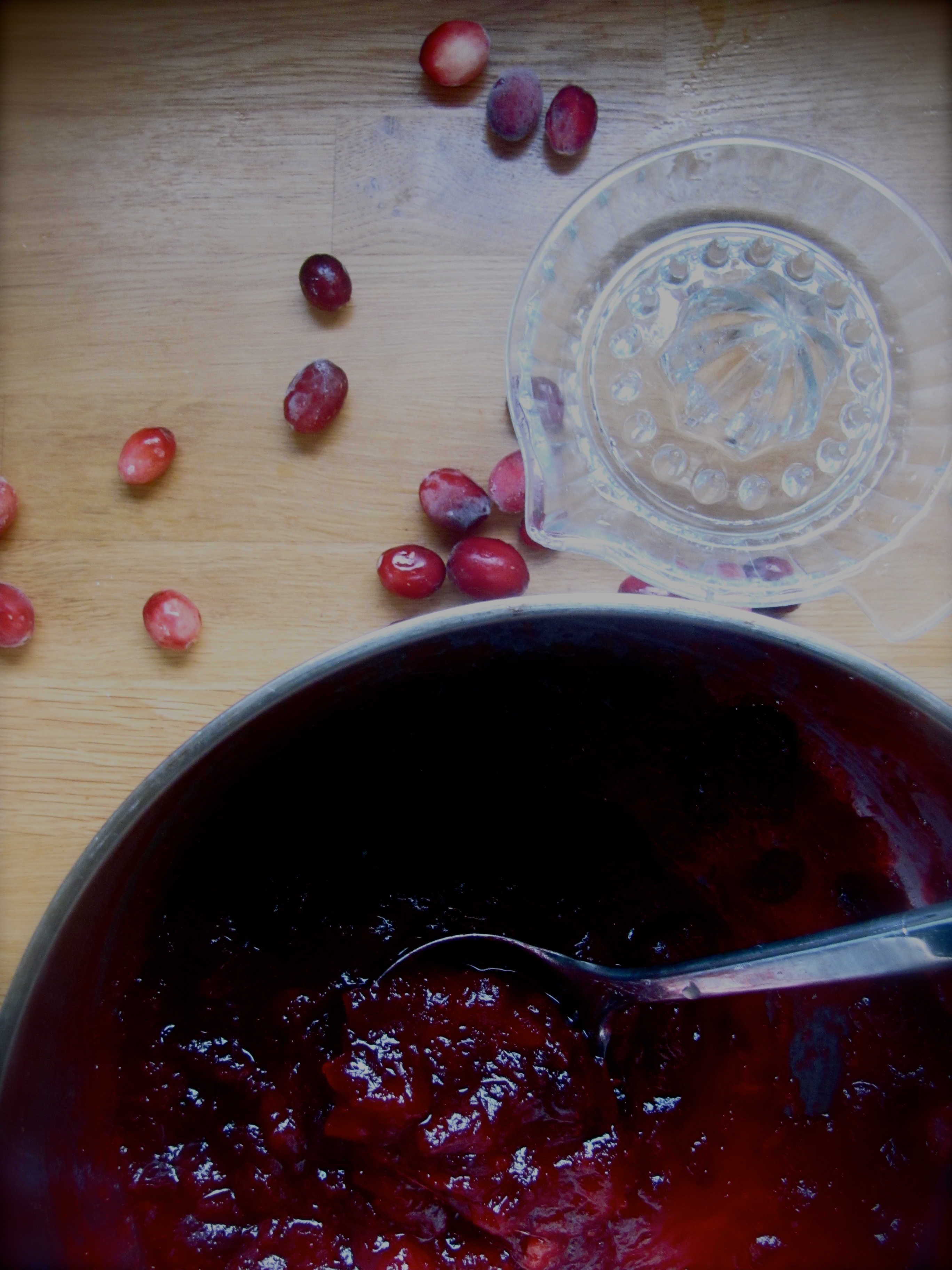 – Boil all of the ingredients together for about 15 minutes. Add a little more orange juice, sugar or brandy until you reach your desired tart/sweet ratio. Mash up any particularly firm berries with a fork. If it seems too sweet add a little lemon juice. Take the cranberry sauce off the heat before it sets completely: it will set further as it cools due to the high pectin levels in the cranberries.