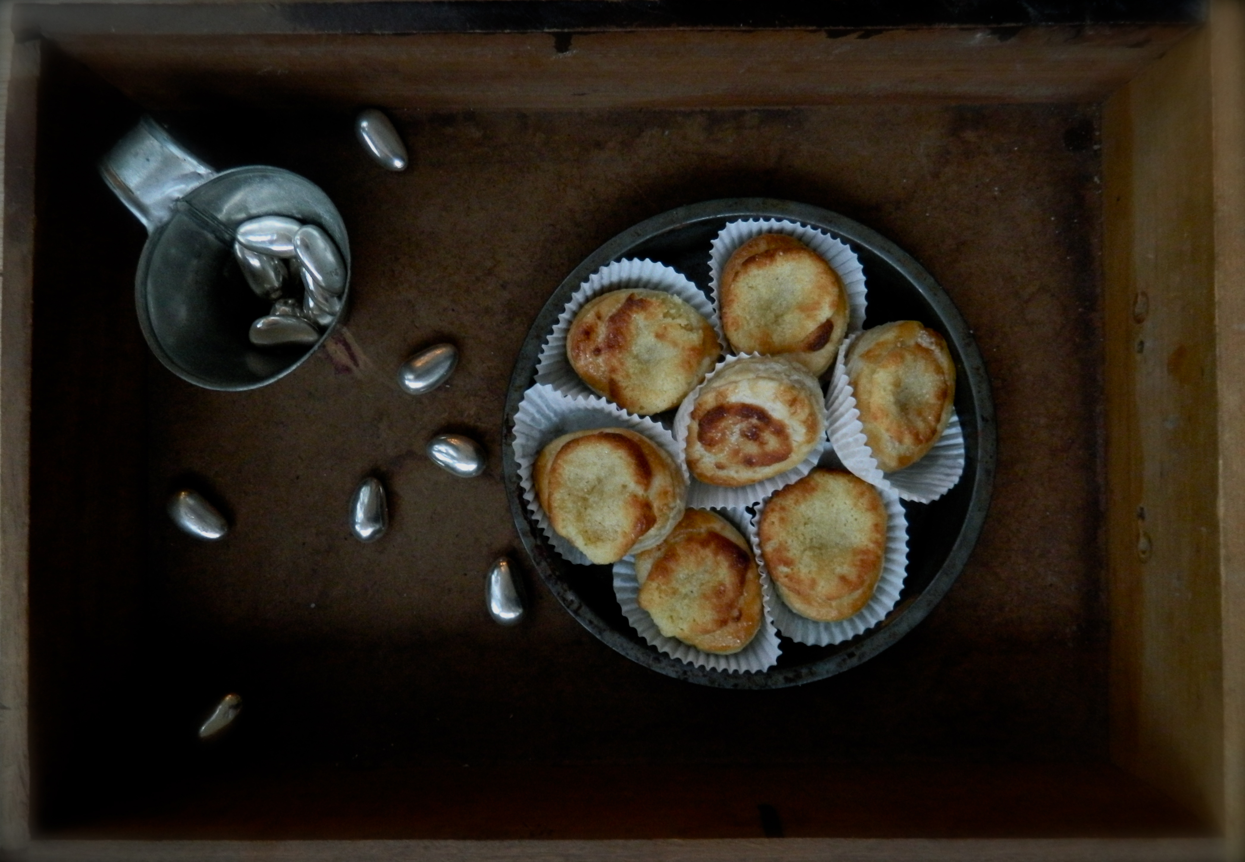 – Preheat oven to 180 degrees and line a baking sheet with parchment. Cream butter and sugar till pale and fluffy and add the two flavours of extract, along with lemon juice & rind, if desired, or a swig of brandy. Beat the egg in a separate bowl and add to the mixing bowl. Thoroughly mix in the ground almonds. Bake the vol au vent cases for about ten minutes, or until they start to rise upwards and turn gently golden. Pull out the centre cap with a teaspoon. Brush the half-cooked cases with beaten egg and spoon about two teaspoons into each case. Continue to bake for another 15 minutes or so, or until the whole bun is golden brown. Transfer from the oven to a cooling rack and sprinkle with caster sugar.