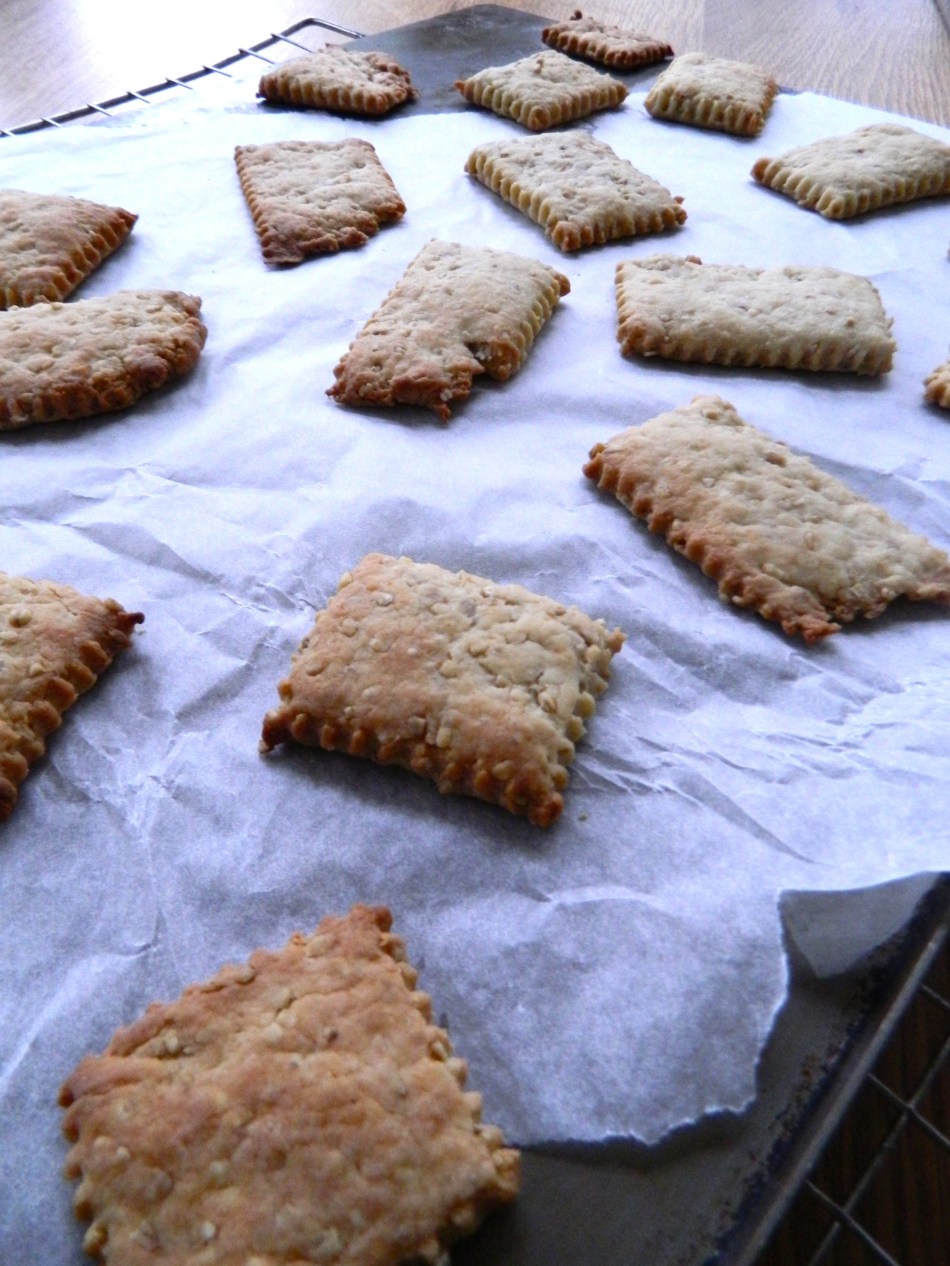 Melt the butter over a low heat. When it foams, add the milk and take it off the ring. Pour the liquid over the (mixed) dry ingredients and stir it together. Leave the dough for 45 minutes to allow the pinhead oatmeal to soften and then roll it out on a floured work surface to the thickness of 1cm or so. Cut it into squares or circles, or use a serrated roller as I did. Bake in a hot oven (180 or so) for about 15 minutes, or until golden then place on a cooling rack. If, when the biscuits have cooled, they aren’t very crisp, return them to the oven for another five or ten minutes and cool them again. Store in an airtight box.