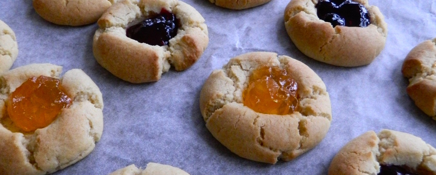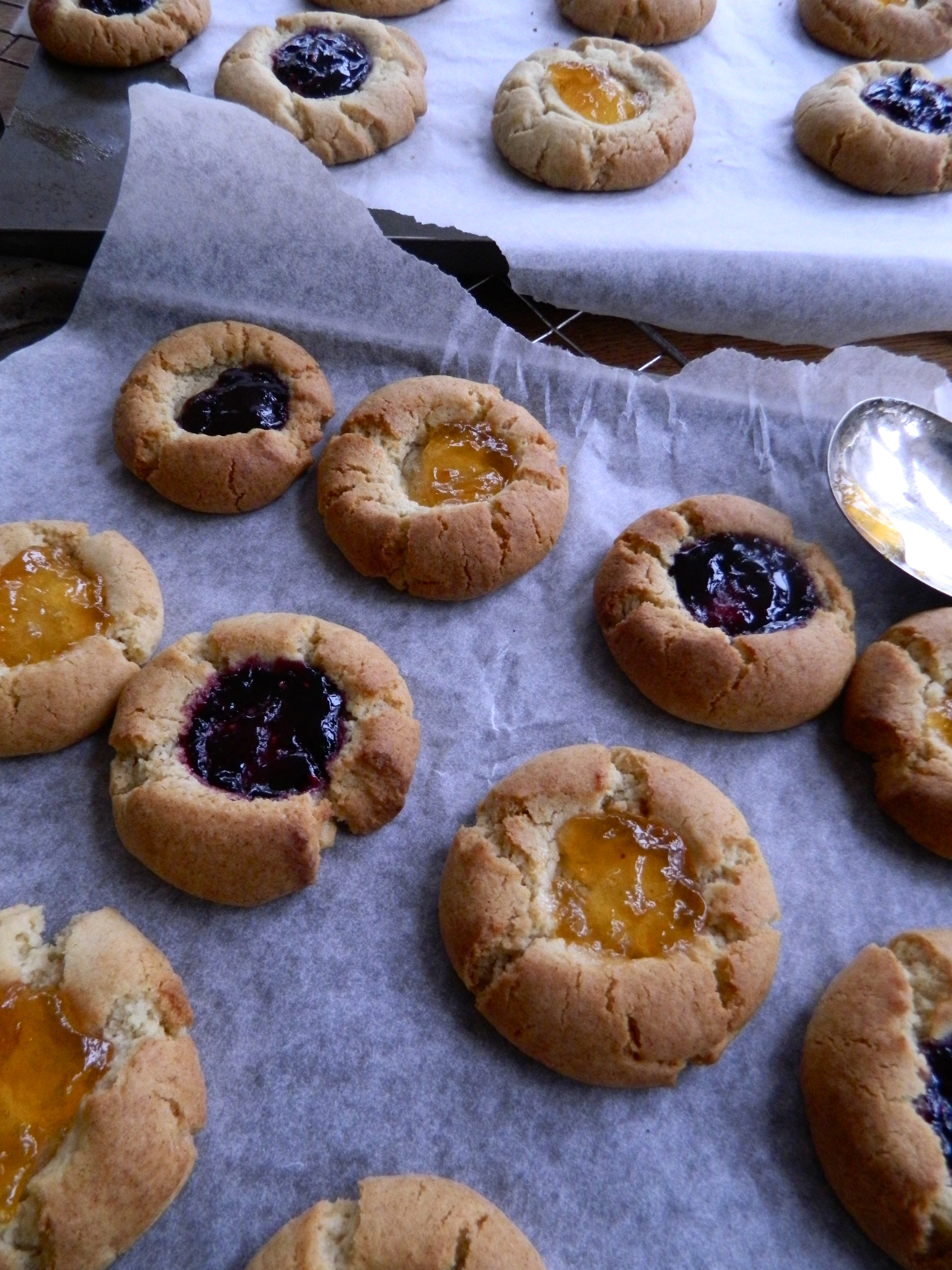 Preheat your oven to 180°c. Sieve the flour and the baking soda into a bowl and add the ground almonds, mix. In a freestanding mixer, combine the butter, sugar, egg, almond essence. Turn down the speed and add the flour slowly, scraping down the sides of the bowl all the while. Bring the dough together by hand. This makes quite a stiff mixture, but if it doesn’t come together by hand, add a tiny bit more butter and mix again. Then shape into a ball and pull off 1inchx1inch pieces of dough. Roll these into balls and place on a parchment-lined baking tray. With a damp finger, press down hard on each ball. Bake for a little under 10 minutes, or until faintly golden and just setting. Remove from the oven, reform the hole with a wine-cork or anything that will make a small deepish circle. Spoon about half a teaspoon of jam into the holes and re-bake for another 10-15 mins. Cool on a wire rack and store in an airtight container.