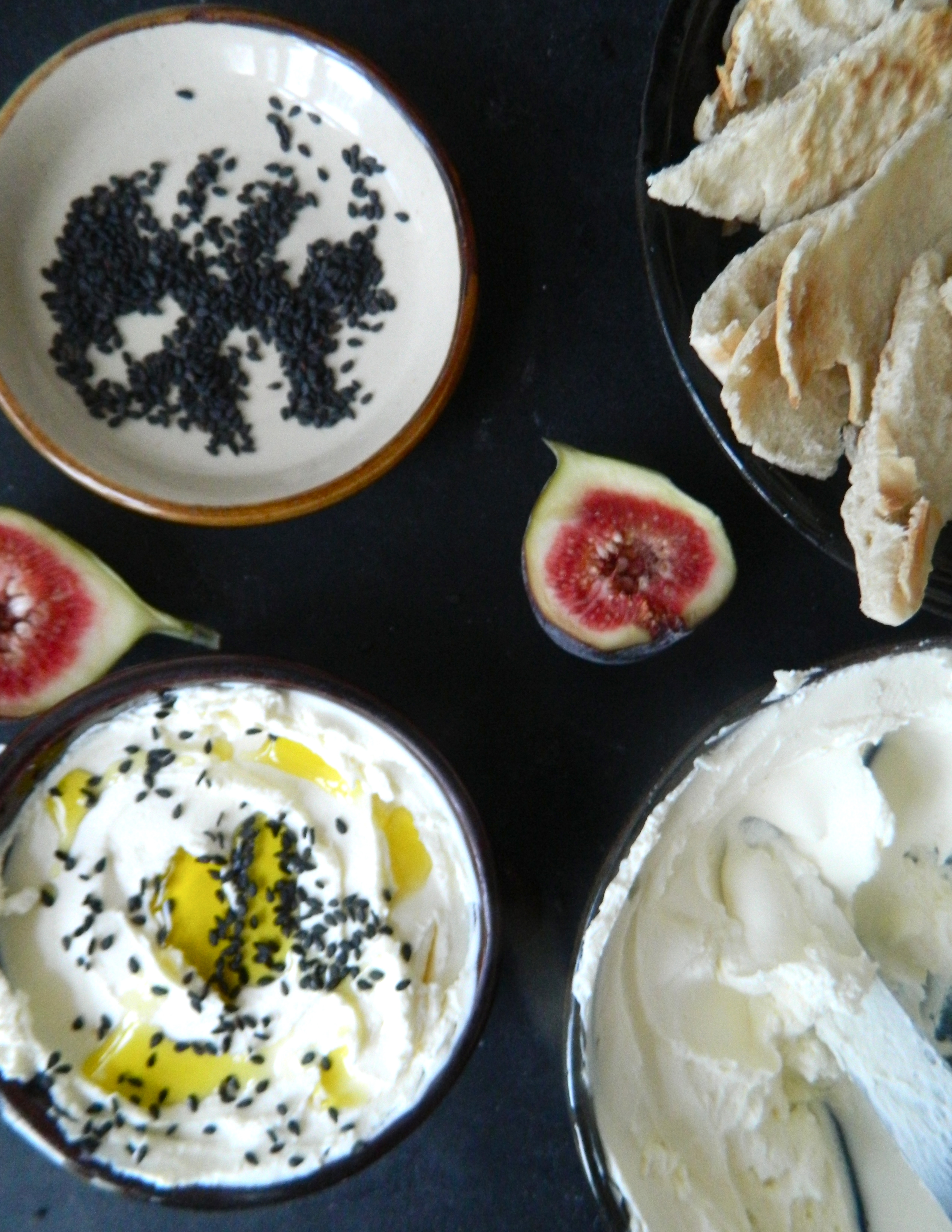 After a little deliberation, I decided to serve my labneh as a starter, with warm pitta; radishes; olive oil; black sesame seeds, za’atar, cumin seed, ground coriander and pomegranate in various forms. Next time I make it, I’m going to try it for breakfast on toasted sourdough with figs, honey and toasted black sesame seed.