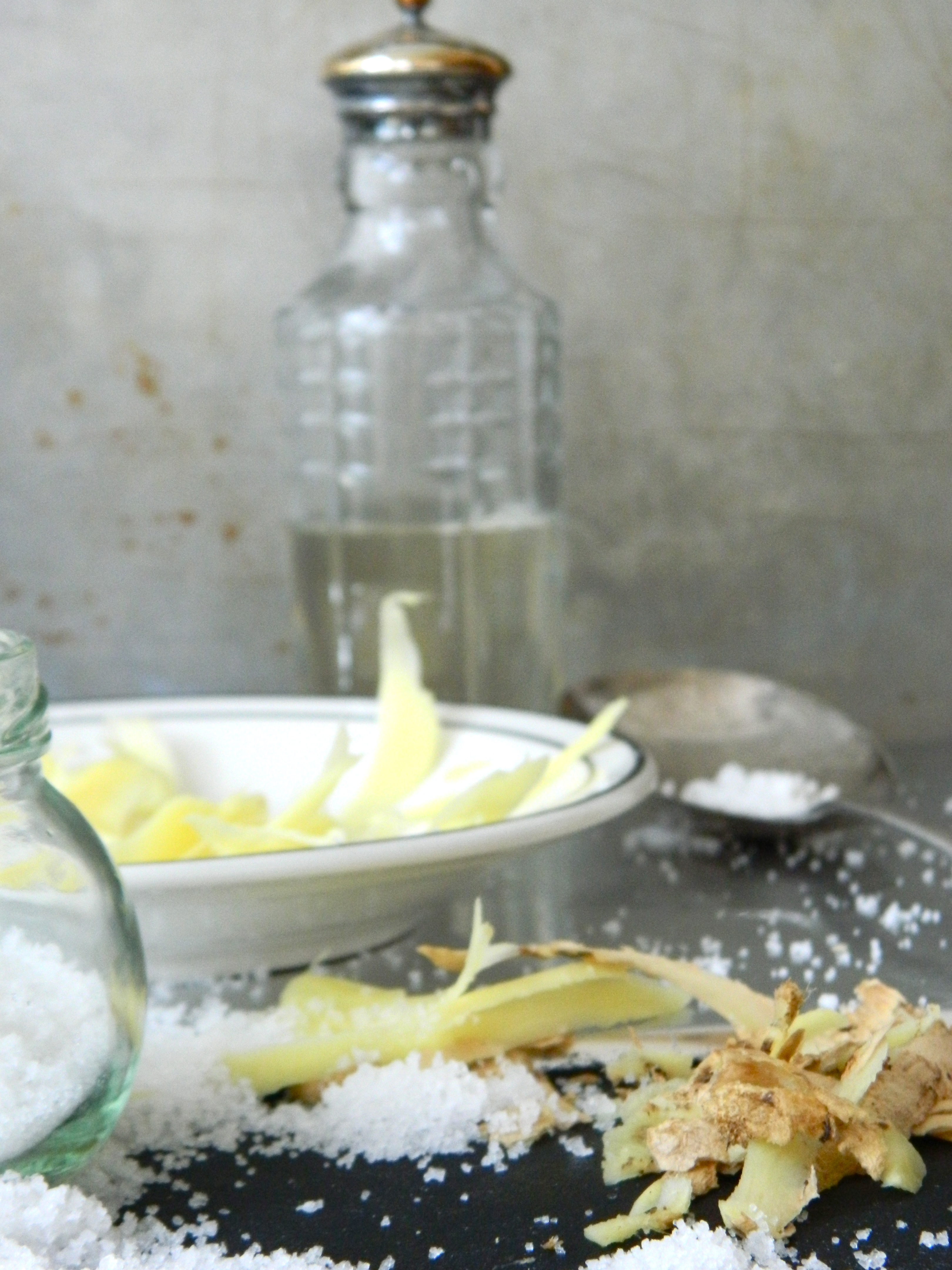 Scrape the fresh ginger with a blunt knife and then slice extremely thinly with either a mandoline (no, I still don’t trust myself to use one) or a good sharp vegetable peeler. Toss it in a bowl with the salt and leave it to sit for an hour to draw out the moisture. Then squeeze out the ginger and rinse. Pat dry. If you have managed to track down young roots, pat them dry flat on kitchen paper. If you’re using ordinary ginger, you can give it a good squeeze at this stage so that most of the moisture is removed. Pack the sliced ginger into a clean, warm jar. Bring the vinegar and sugar (30g if you don’t like it too sweet) to a quick boil. When the sugar has dissolved, pour it over the ginger. Give the mixture a stir and cover with a vinegar-proof lid if possible (ie, non-metallic). Leave to cool. Keep it in the refrigerator and use within 6 months.