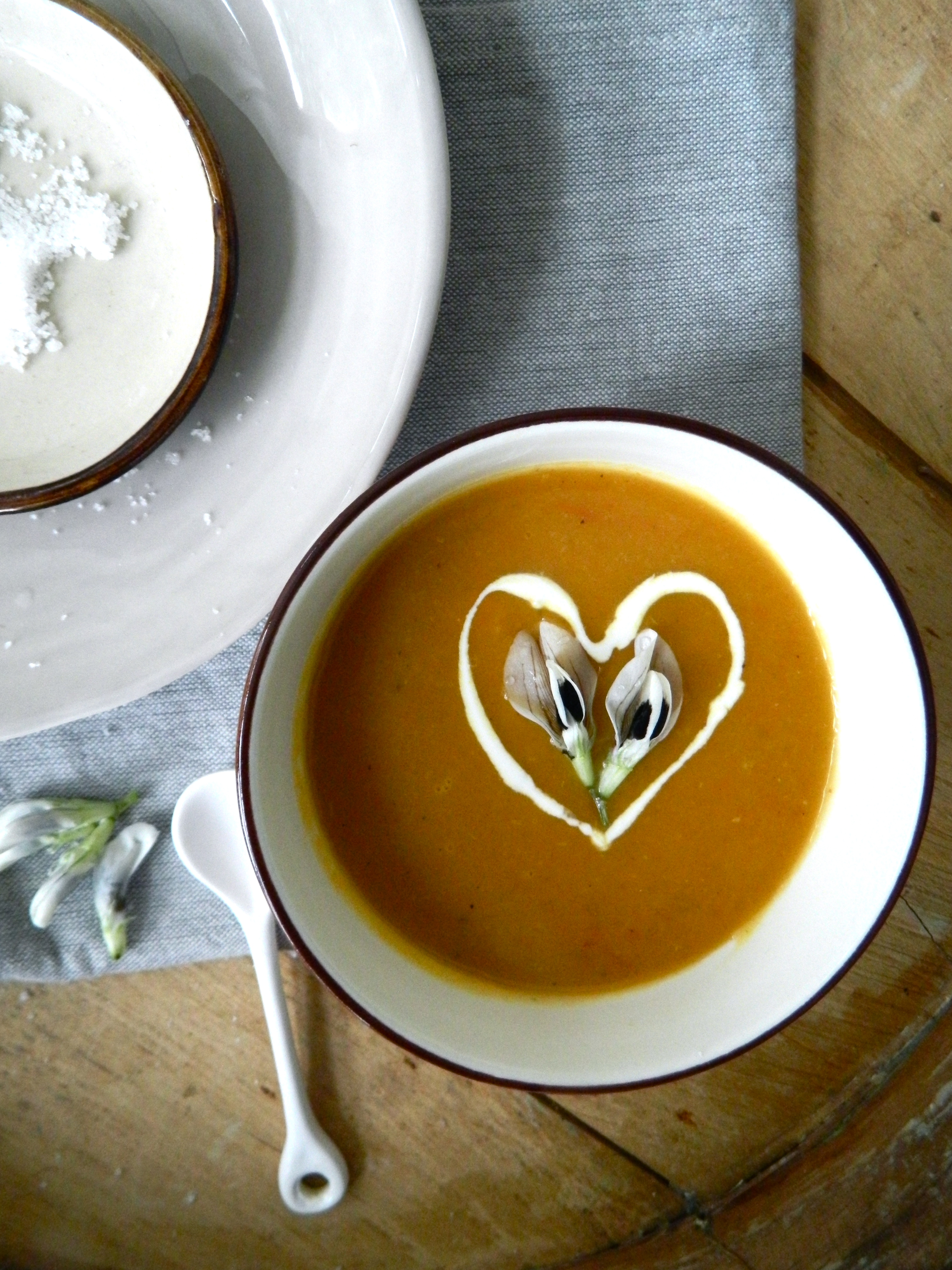 Not every summer day is for salad, and on a damp, grey June afternoon what you really need is soup. But leek & potato or cream of chicken don’t fit the bill either, as cream or potato based soups are inevitably too heavy, too insulating and too rich for this time of year. A light, satisfying and slightly exotic soup is what is required, served in small bowls with pretty garnishes and interesting textures. I like to use a simple butternut squash soup as a base, and then add herbs, flowers, oils and any other additions to make it into a lovely summer meal.