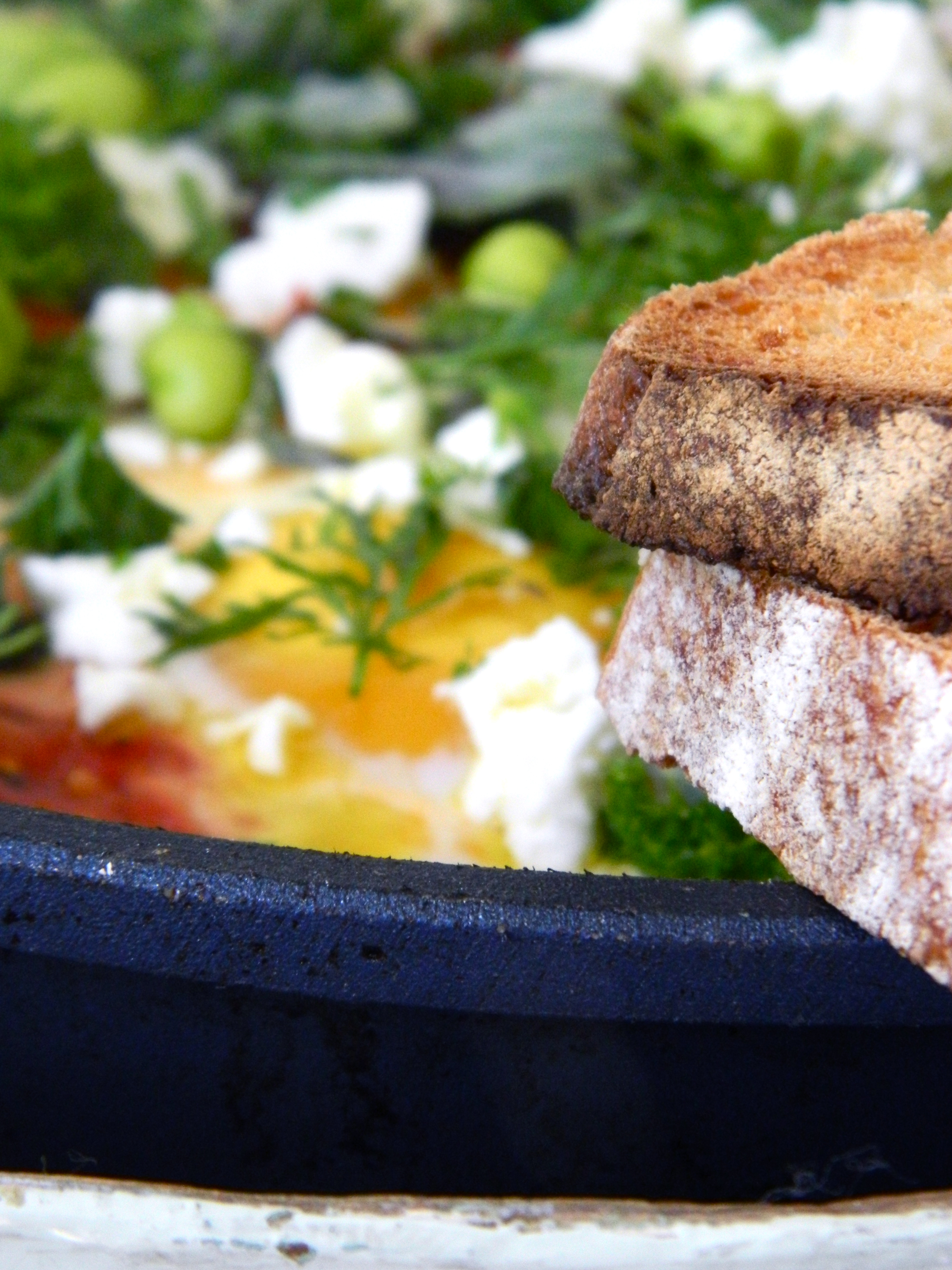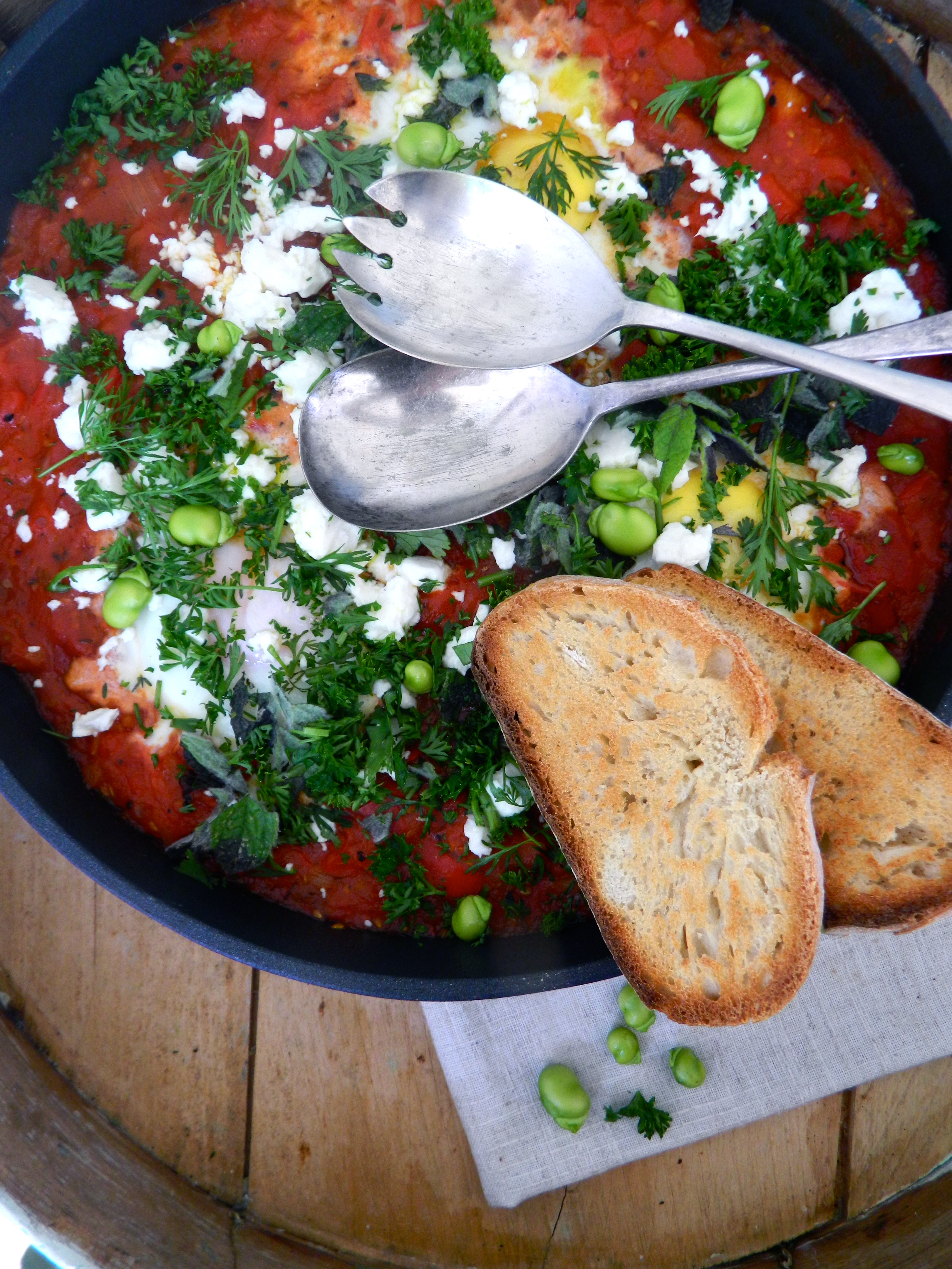 Chorizo is not traditional but would be delicious in it, as would a few chunks of merguez, that potent North African sausage. According to Claudia Roden, expert in all things Eastern, broad beans are traditional, so I’ve scattered a few from the garden on top. Artichoke hearts can also be added. Serve with crusty bread or toasted pitta, fresh fruit and a variety of cool, minty juices. This recipe is adapted from Yotam Ottolenghi’s version from Plenty, which seems to be the inspiration for many others on the internet.