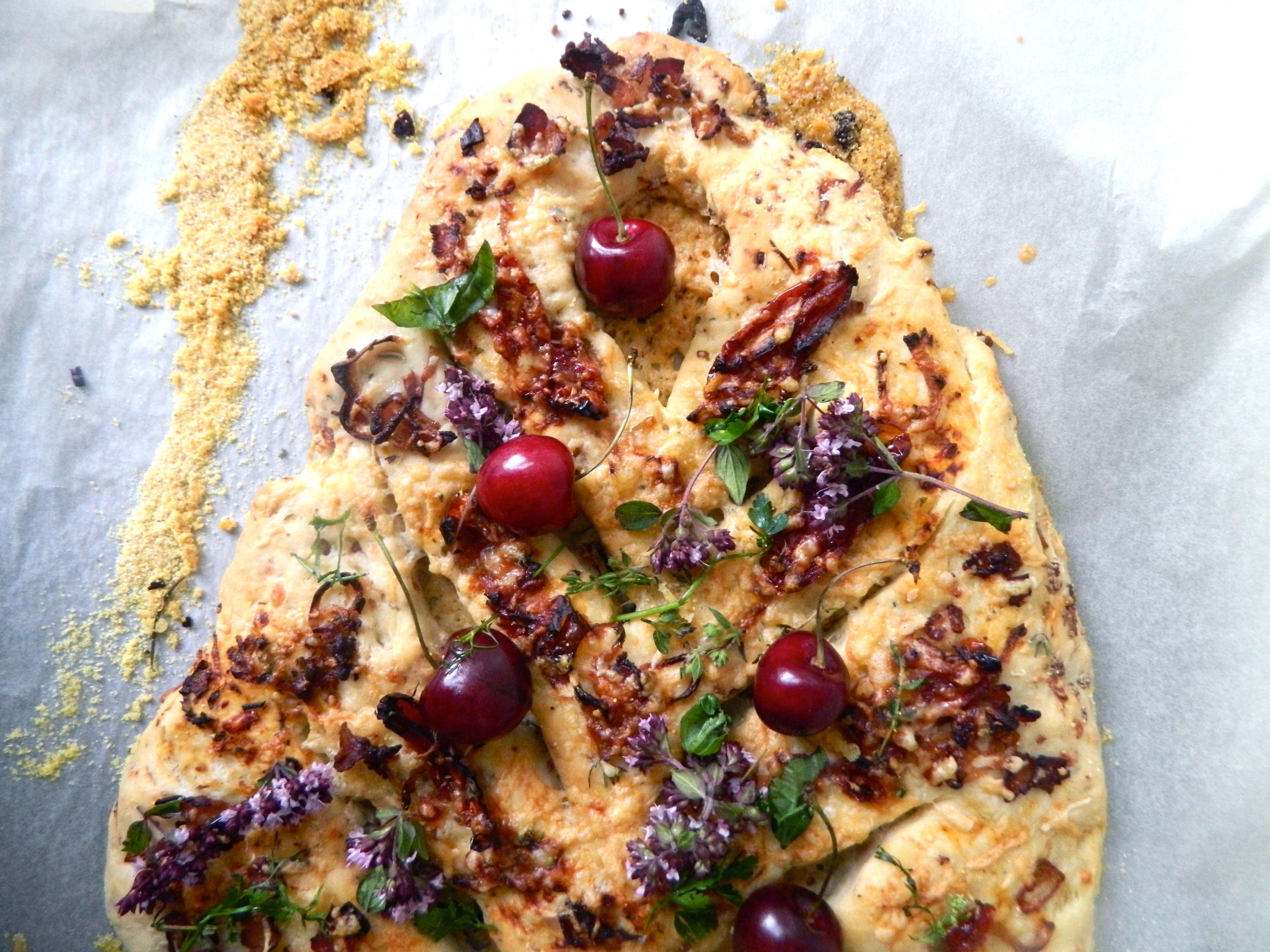 Mix the sugar and salt into the flour and rub in the butter. Stir in the herbs and the yeast and pour the water in. Stir it with a spoon and then bring it together with your hands. Knead the dough on a floured work surface for eight minutes then return it to the bowl, cover it with clingfilm and leave it in a warm place to double in size for an hour or so. If you’re using lardons, fry them till crisp and well-cooked and drain off most of the oil. Add the sliced onion and fry just for a minute or two. Leave to cool. Knead about half of the grated cheese into the dough and then knead the bacon and onion pieces into the dough on a floured work surface. Divide the dough in two and roll each half out into a long elongated oval, placing it onto a parchment-lined baking tray. Cut darts into the dough with a sharp knife and pull it into the typical fougasse shape (=> Google Images). Leave to prove for 20 mins while the oven heats up, to about 180 degrees c. Splash a little water into oven to create some steam. Cover the breads with more cheese, oil and whatever other toppings you want. Bake for 15-20 minutes and serve with more oil and herbs.