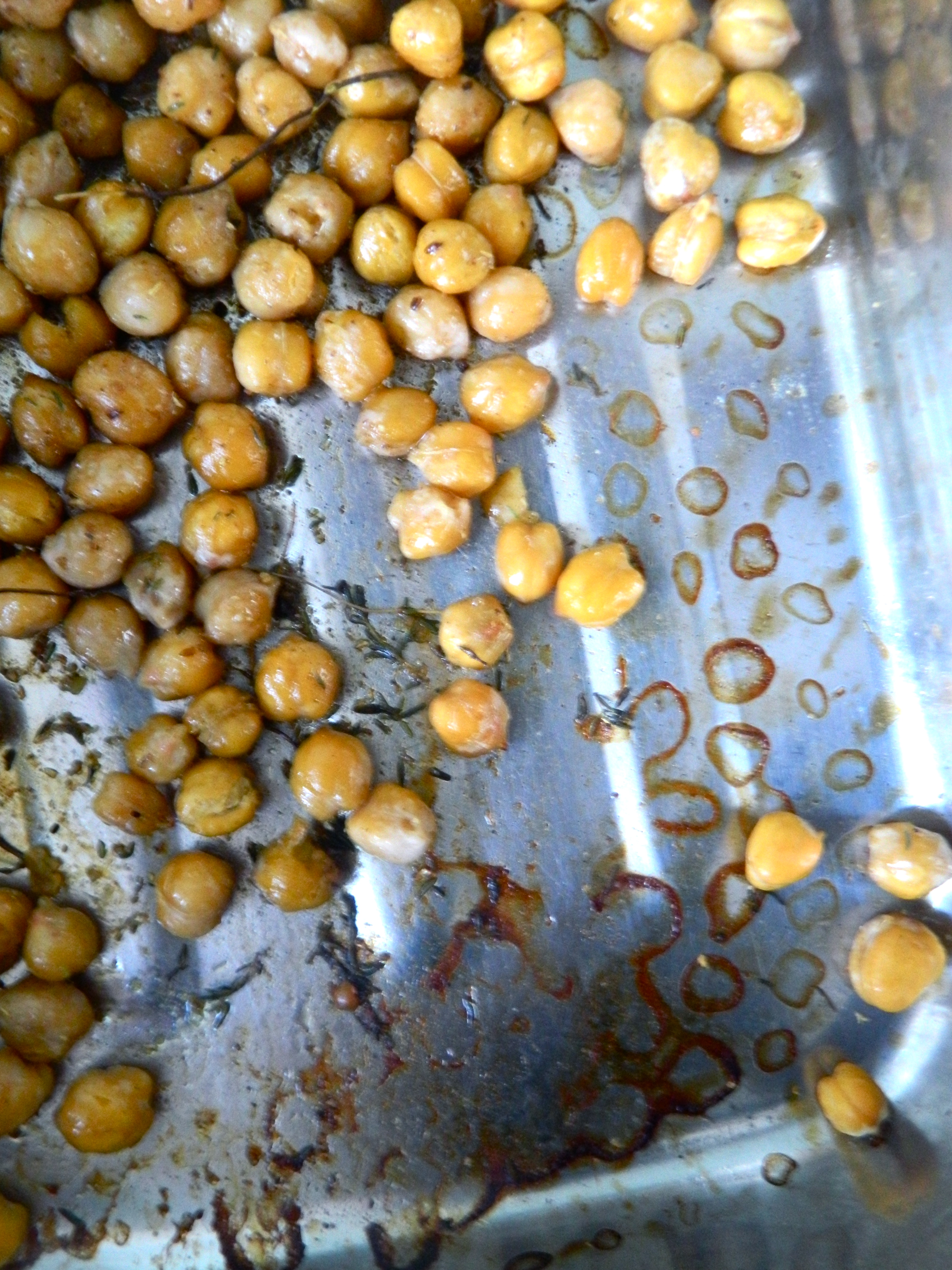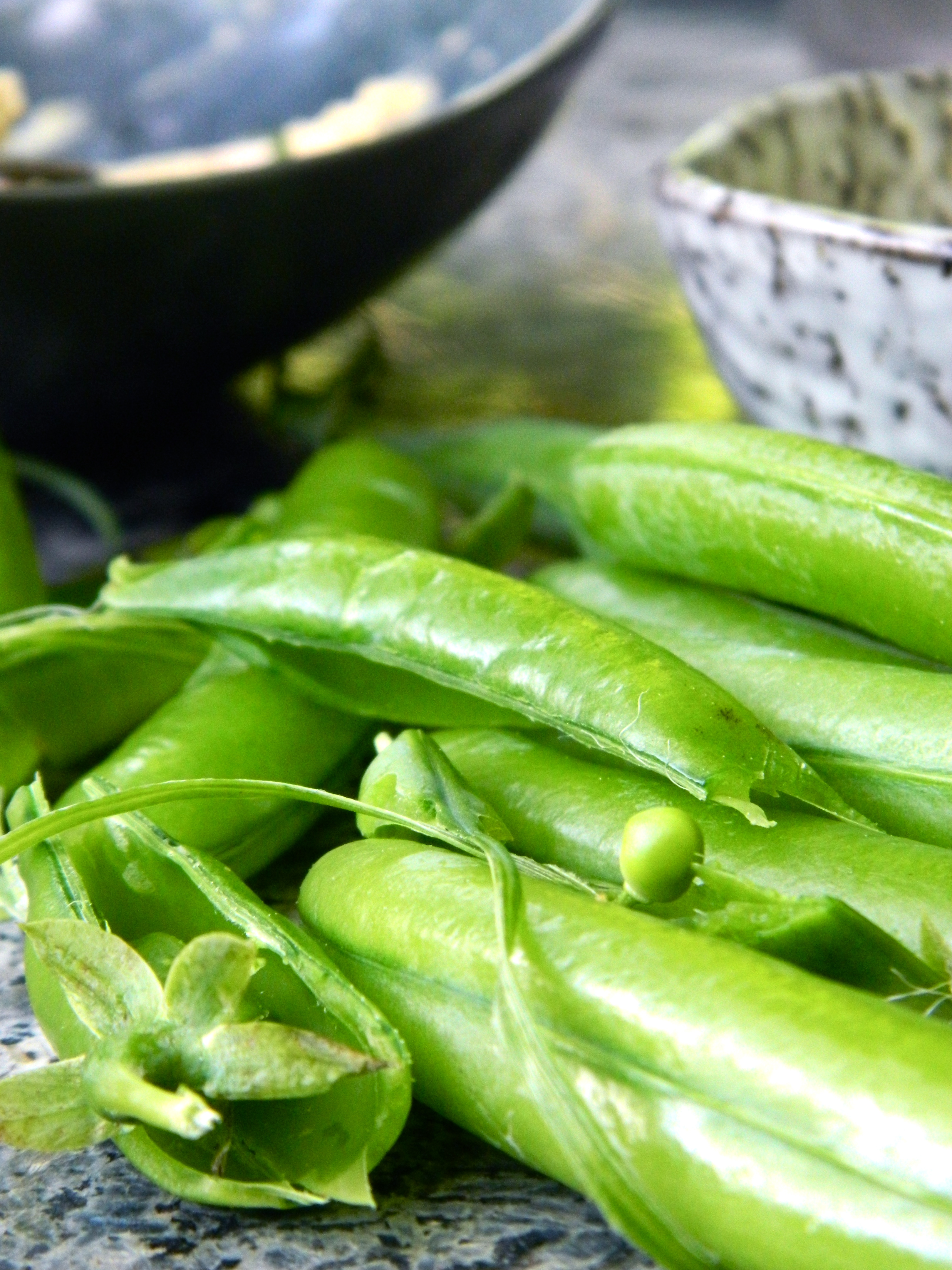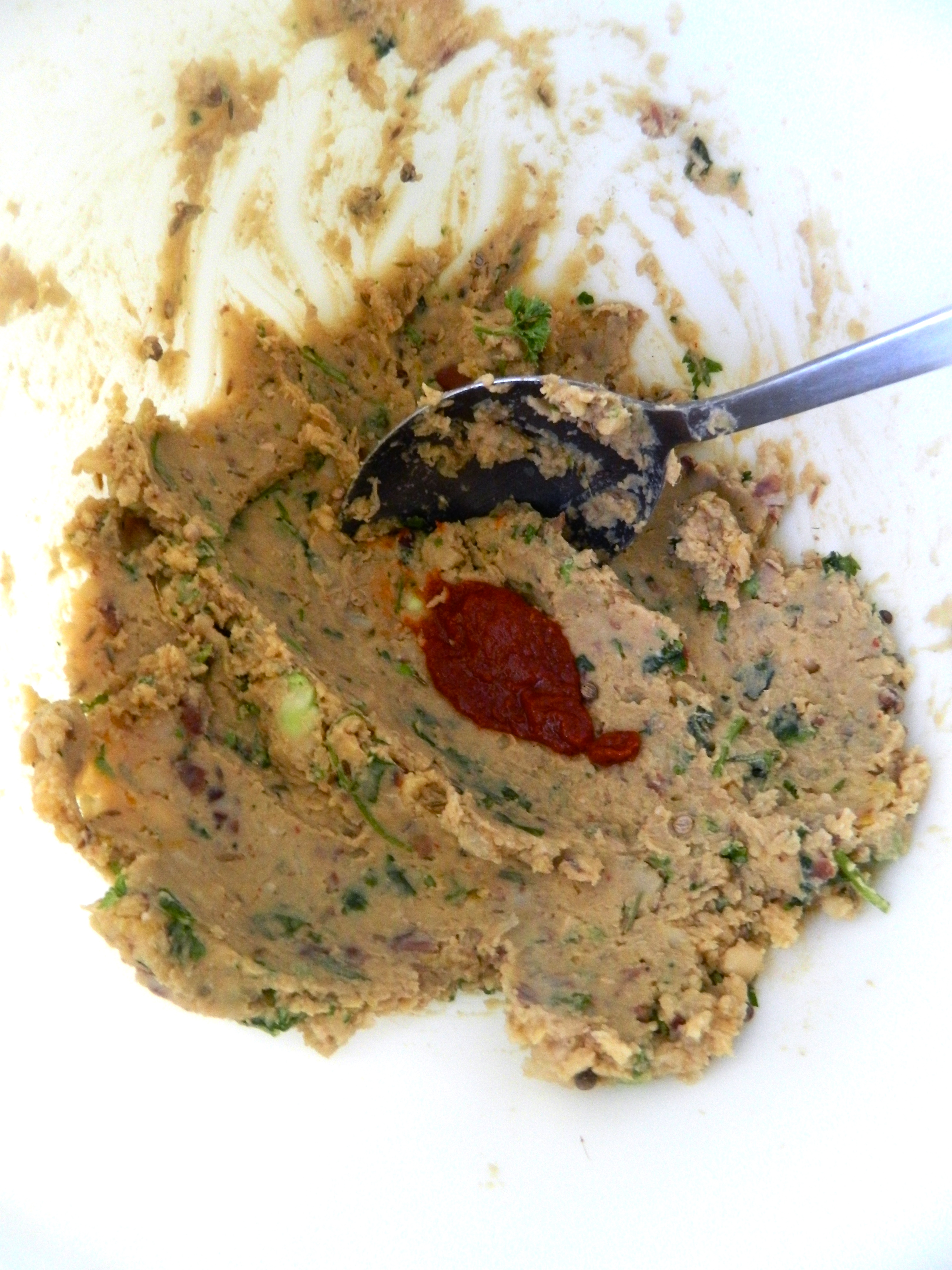 Incorporate all of the ingredients either by hand or in a food processor until lumpy but not puréed, then add the peas and beans at the end to keep them whole. Chill the mixture for 10 or 15 minutes at this point if you can. Using wet hands, mould the falafel mix into about ten tight little patties or spheres – pat the sides with your hands to compact them (Felicity Cloake suggests rolling them in sesame seeds at this point, which sounds good). Pour a decent amount of the oils into the pan and heat. Fry the falafel in the oil and turn over when the side touching the pan has become crisp and golden. Repeat for all sides and either serve immediately or cover and heat up again later in the oven with a little more oil.