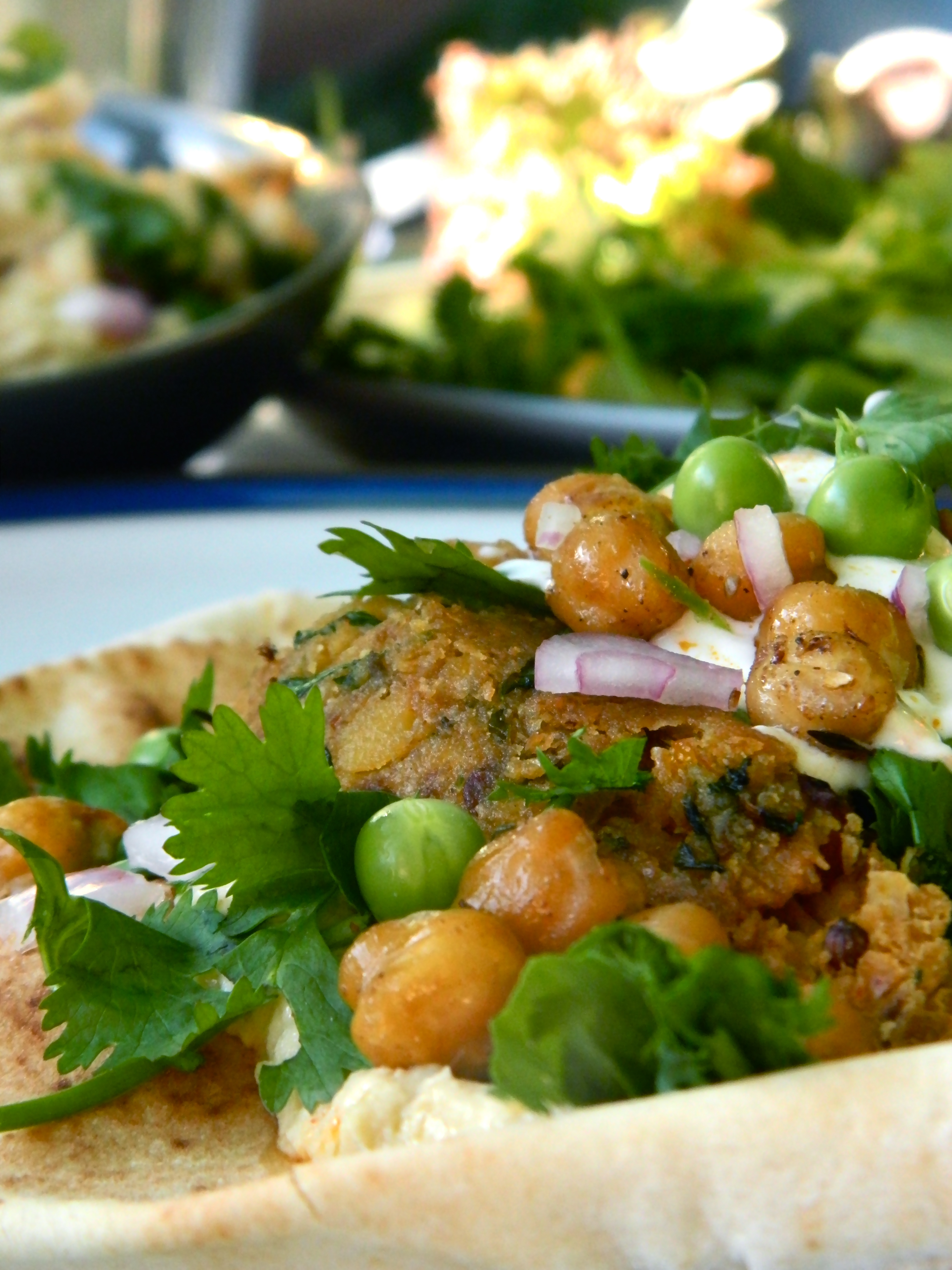 I had resigned myself to using pitta when I found ‘fresh wraps’ in Tesco (and probably elsewhere too, as they’re from a mainstream brand), which are a pretty good approximation of the flatbread you get at markets. Once I had my flatbreads sorted, I decided to make broad bean and pea falafel, tahini hummus served with diced red onion, coriander, pickles and thyme roasted chickpeas. Alongside these we had yoghurt with a swirl of harissa and olive oil, fresh peas from the garden and small, sweet cherry tomatoes. The falafel (adapted from a Jamie Oliver recipe, whom I secretly adore) worked out really well, and they were easier to make than I’d expected. They also tasted great – really herby and fresh – and were perfect for a sunny garden dinner.