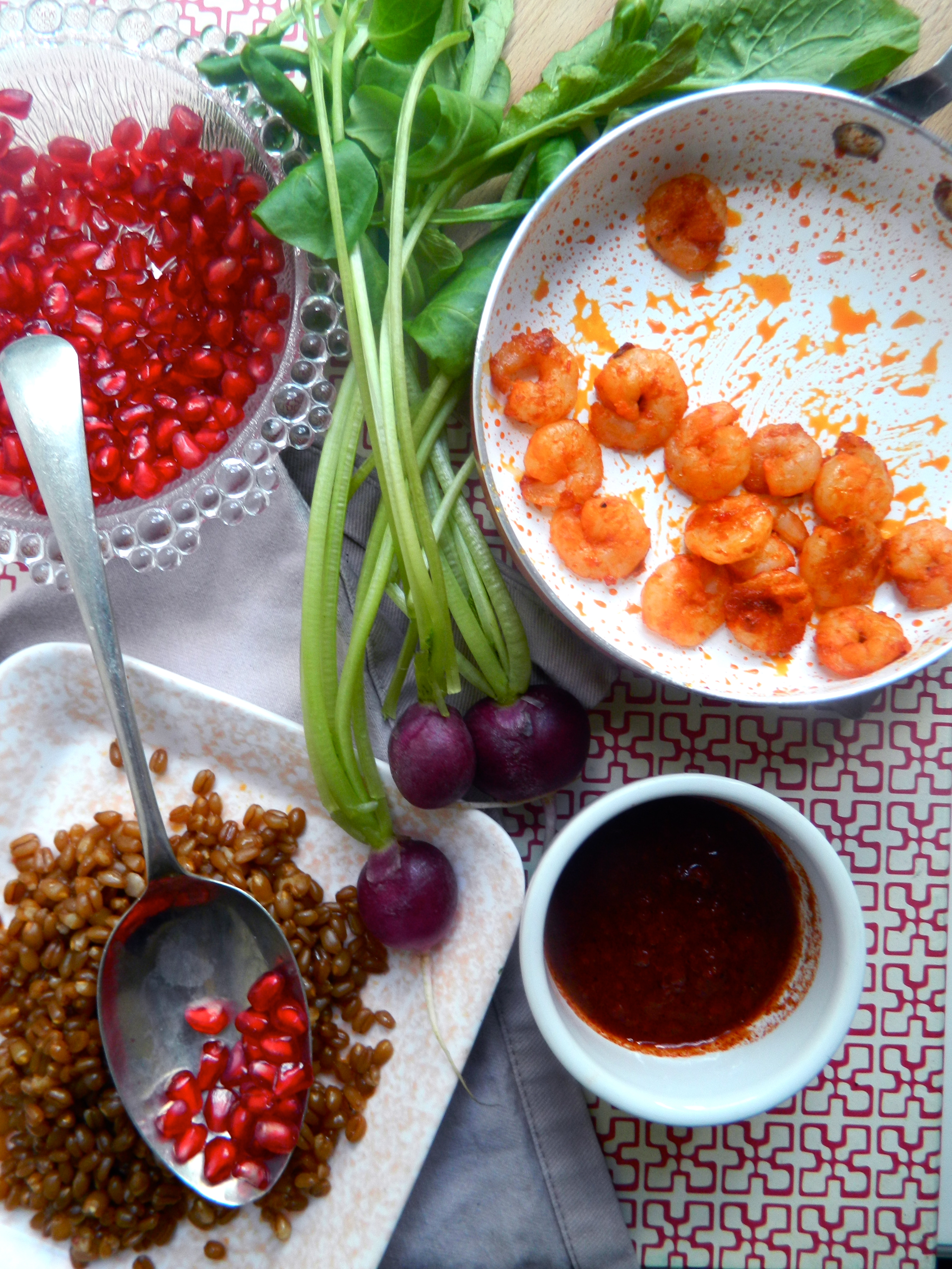 Wheatberries are perfect as the base of vegetable-heavy, herb-filled salads like this one, and they’re as tasty fridge-cold as they are served warm or at room temperature. They’re are also good for you – they probably are a lot easier to tolerate than orzo and cous cous, if that’s an issue, and because they contain both the bran and germ of the grain (label that diagram, Home Ec people) they also have lots of fibre and vitamins. Here I’ve served them in a salad with garlicky, harissa-spiked prawns, pomegranate seeds, flat leaf parsley and some beautiful, shockingly purple radishes from M&S. This prawn salad would be great as a starter or side in a Middle Eastern feast, or it would make a perfect ‘girl-food’ lunch if you’re having friends over.
