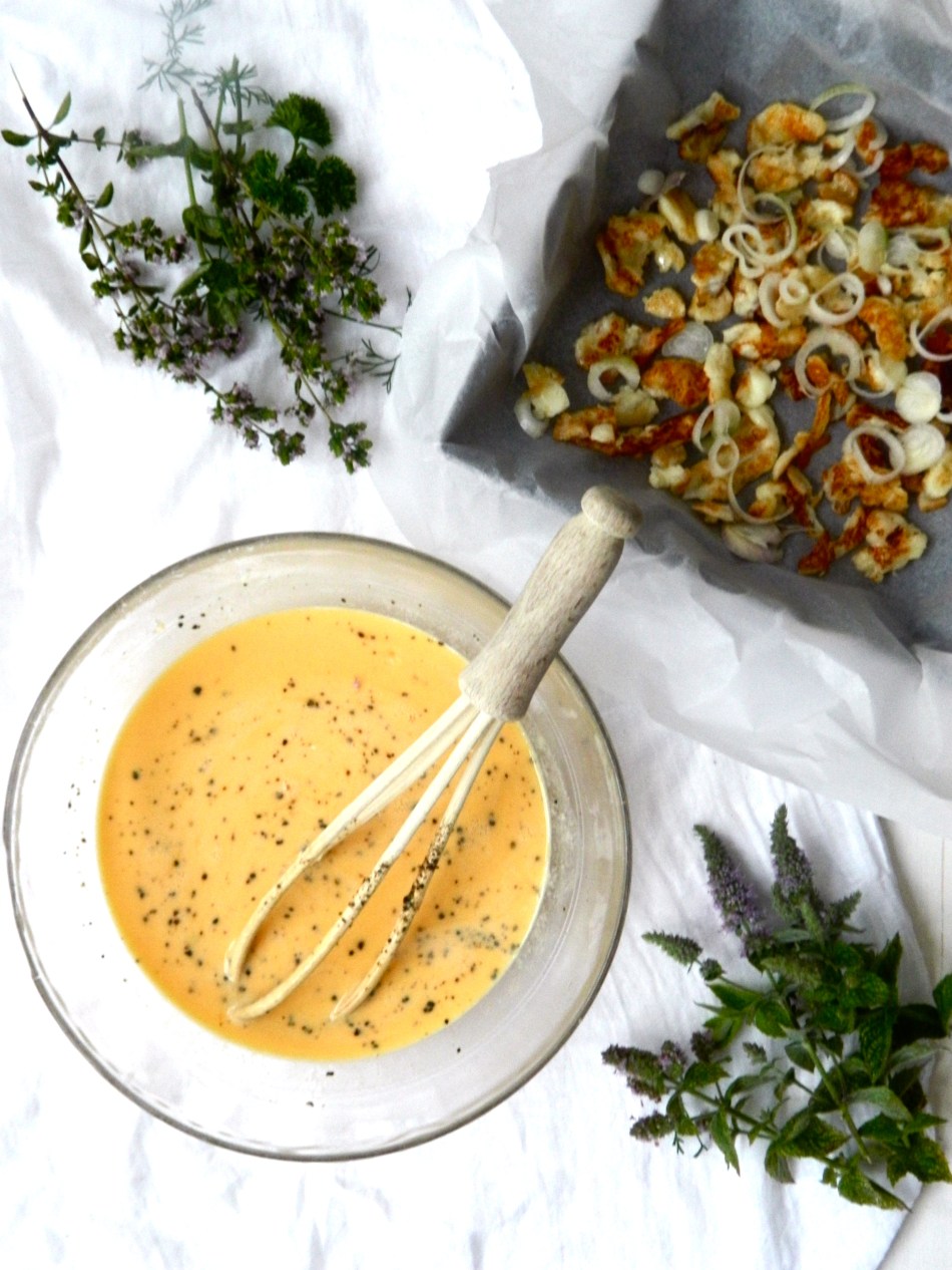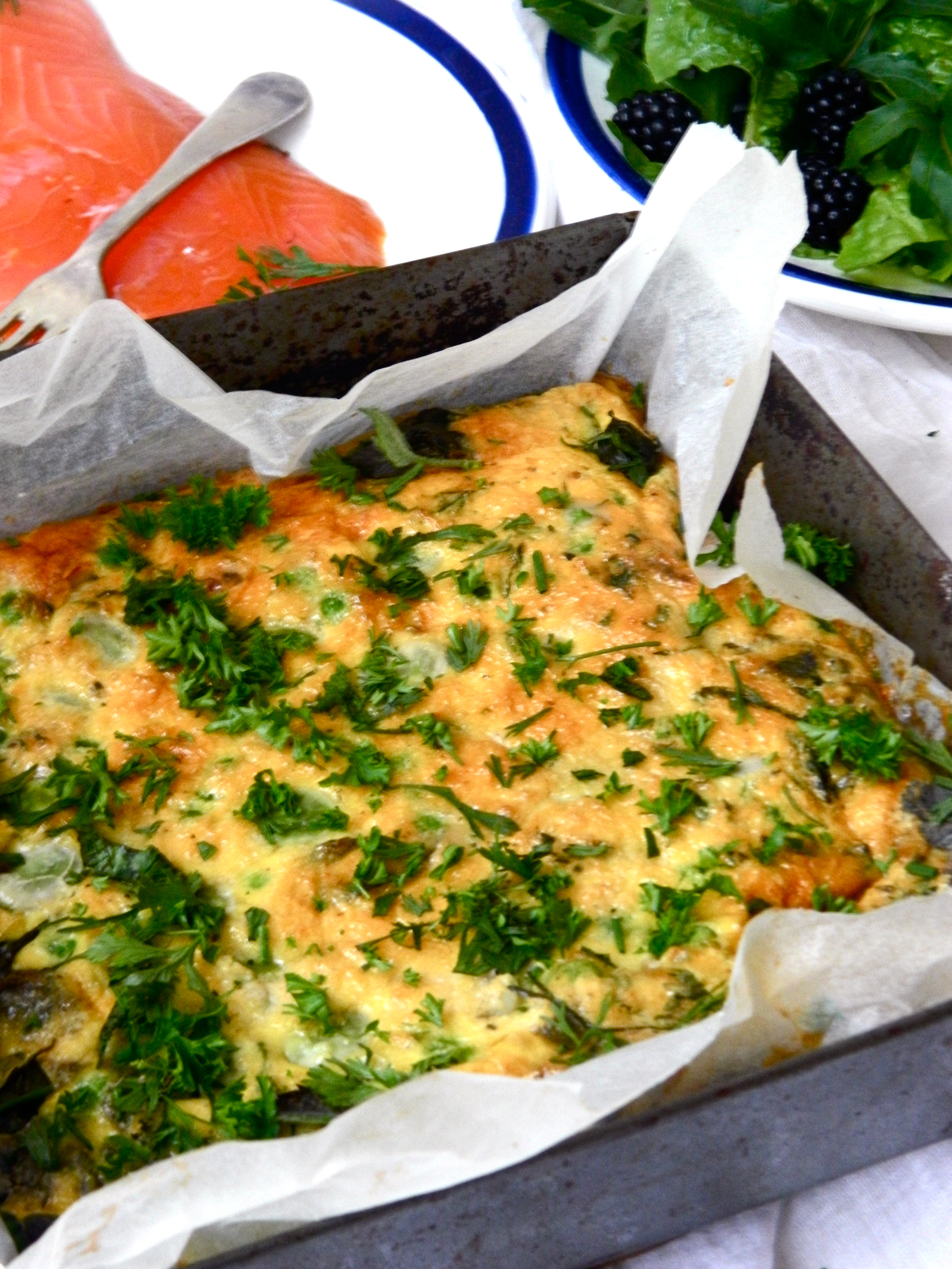 What I love most about this recipe though is how customizable it is – you make up the egg mixture and then add ‘about 100g of meat’ (if you like, or you can keep it vegetarian), ‘250g of cheese’, ‘100g of vegetables’ and ‘about 30g of herbs’ – this could mean a mix of chorizo, manchego, grilled red peppers and flat-leaf parsley, or shredded roast chicken, feta, butternut squash and mint – basically anything you can come up with…or have lurking in your fridge. It’ll be deliciously different every time you make it!
