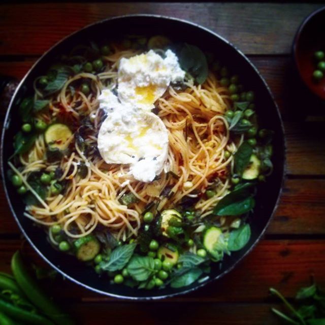 -For another use for your burrata, try it with aglio e olio spaghetti, peas, baby courgettes and fresh herbs. Boil spaghetti, and, in a large frying pan, gently heat olive oil with diced garlic, chili flakes and sliced courgette. When the spaghetti is ready, tip it into the frying pan, add the peas and toss for a minute or two over heat. Dress with herbs and set the burrata ball on top of it just before serving. Then tear it asunder at the table and dig in.