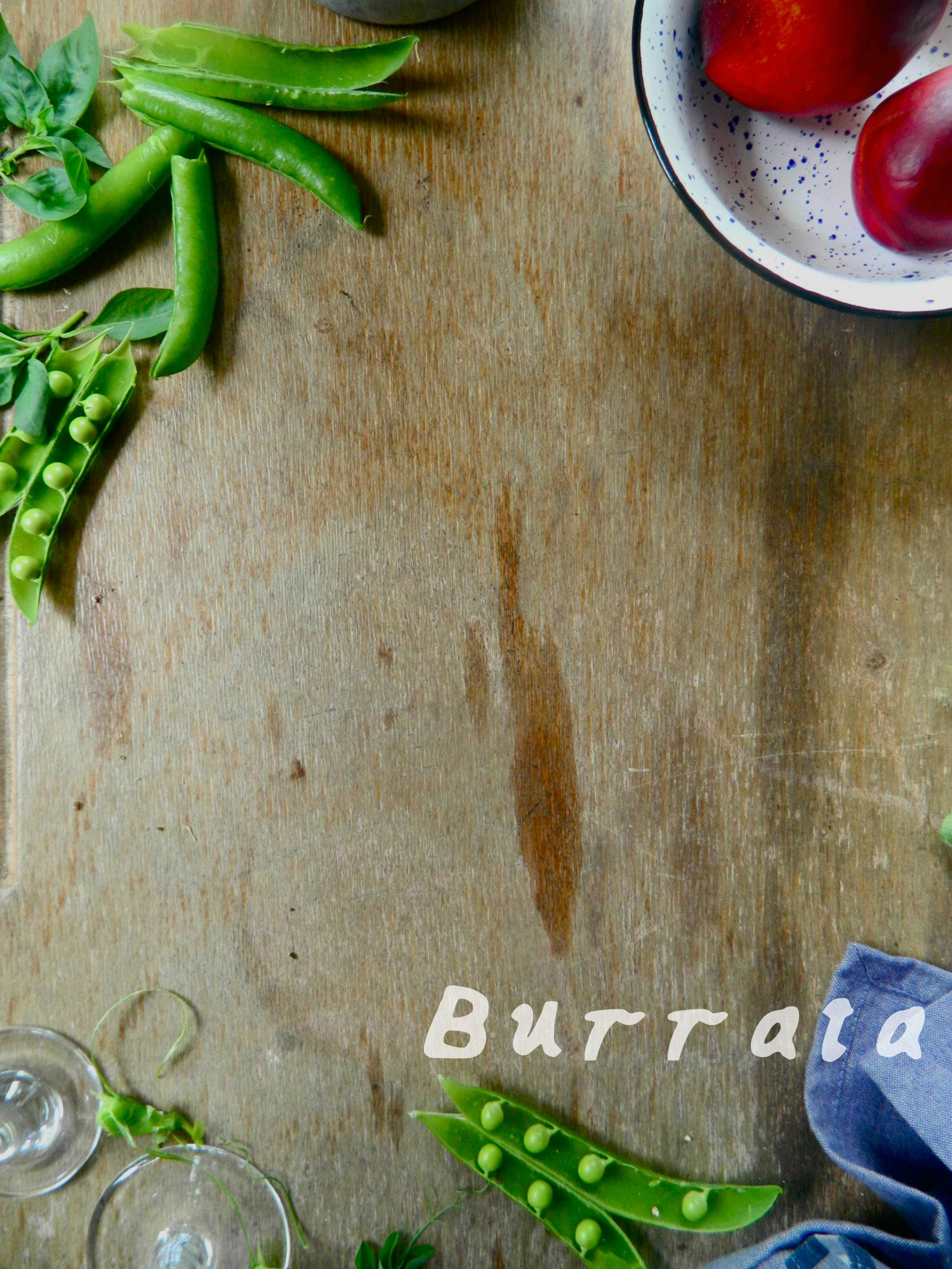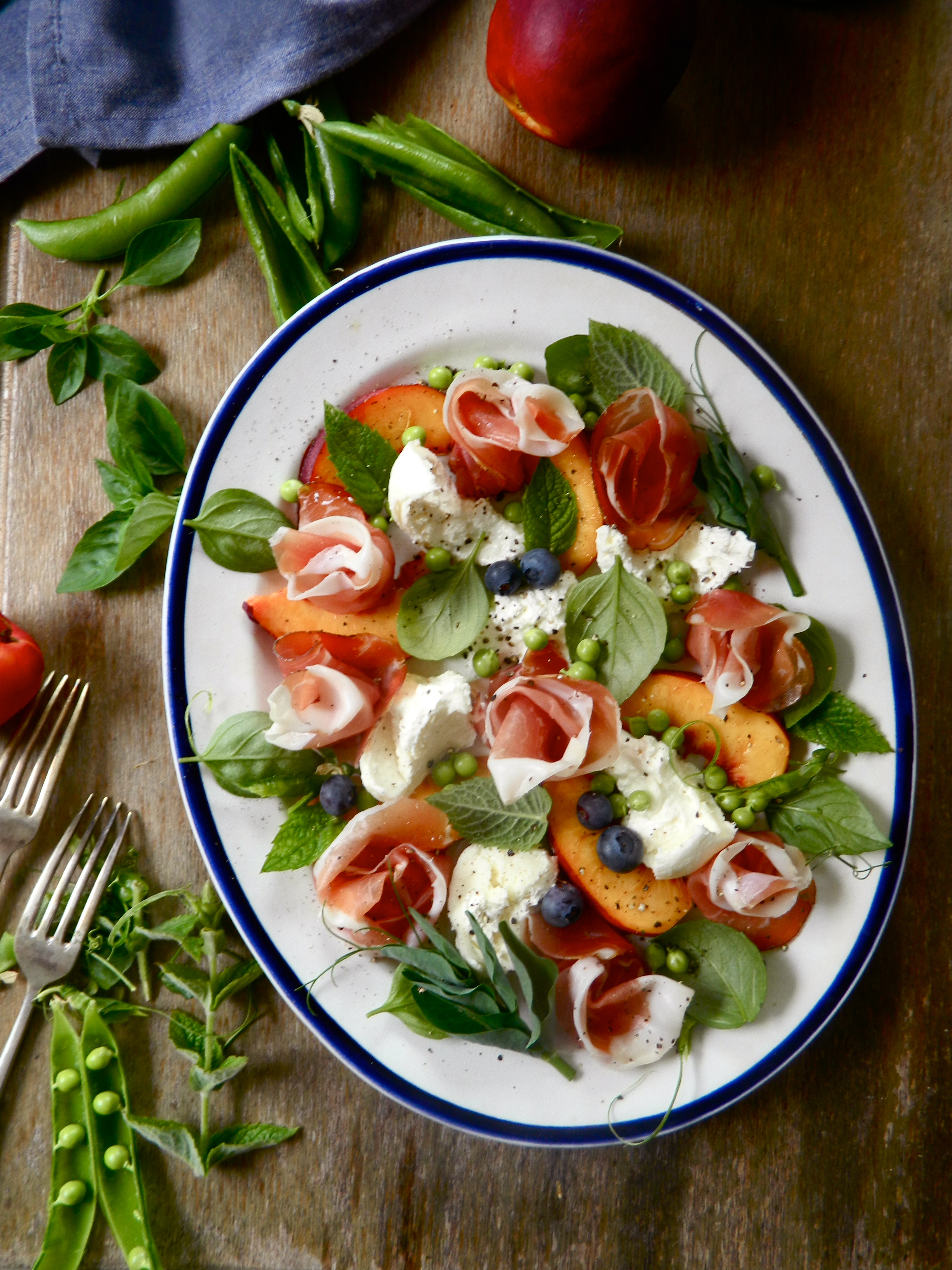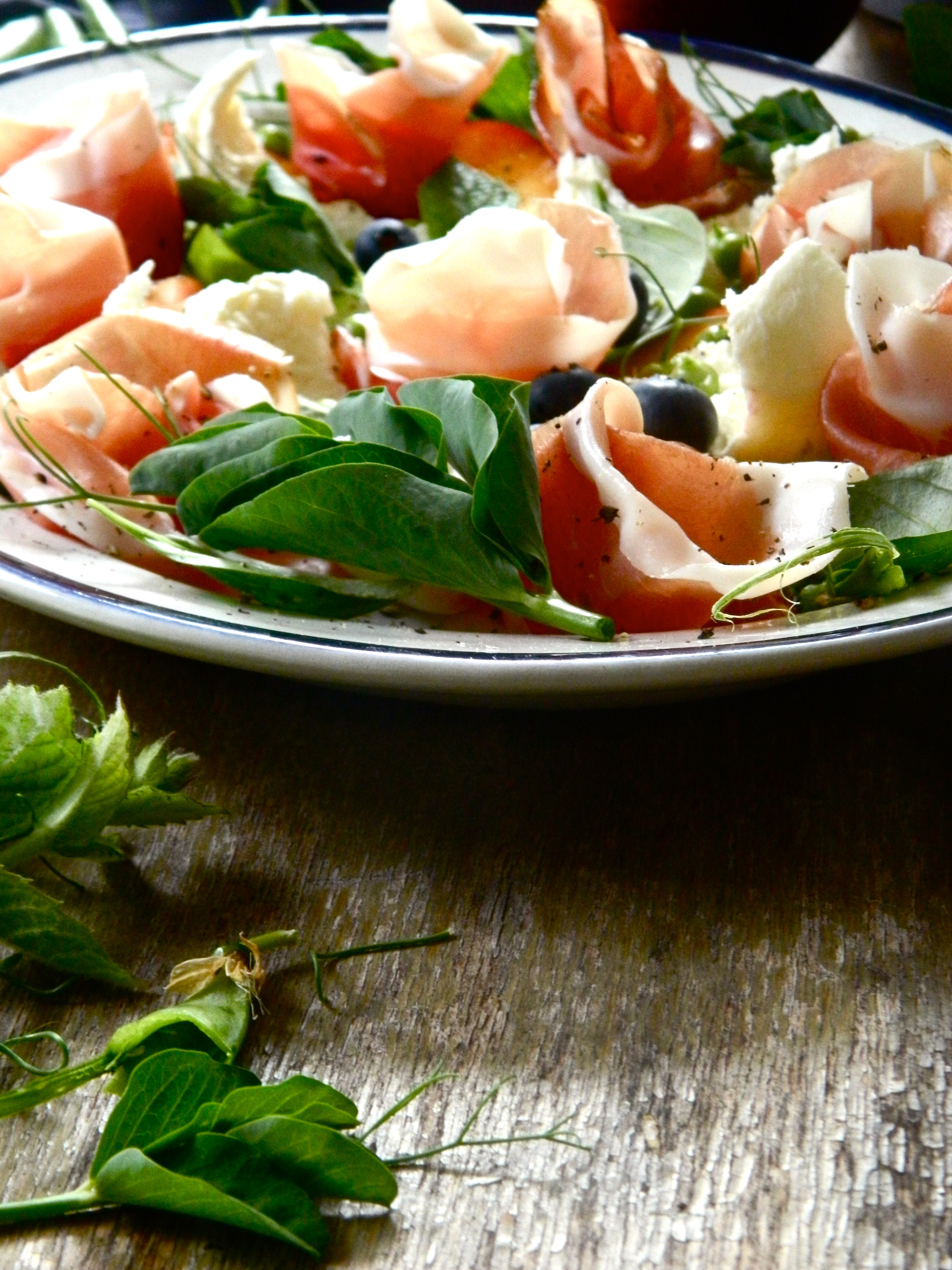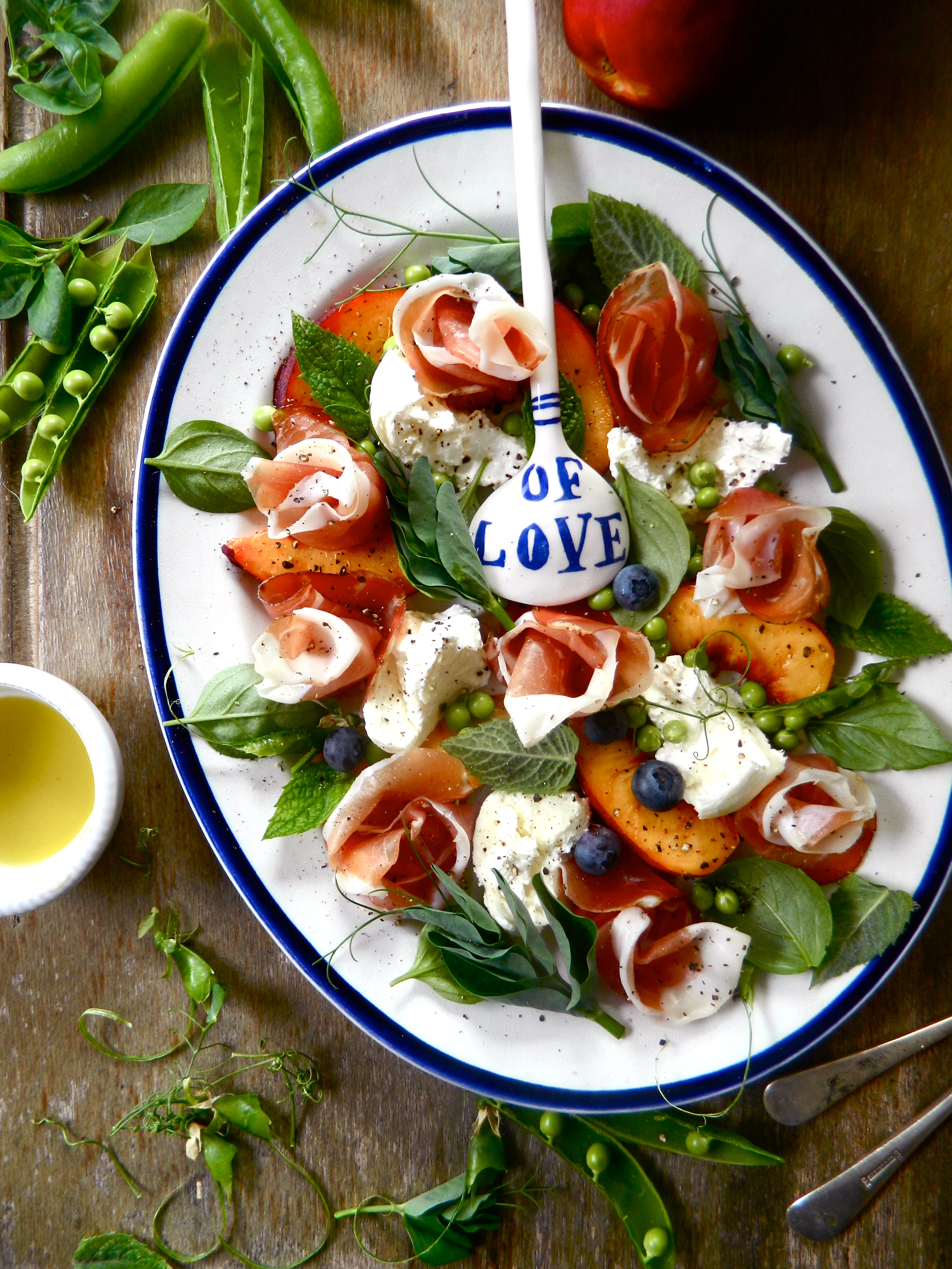 To make it, flatten your burrata (or buffalo mozzarella ball) with the back of a spoon and spread the pieces across your serving plate. Slice a ripe nectarine and move the segments around the plate. Roll slices of speck or parma ham up, with the line of fat on the outside, so that they look like roses, and place them throughout the nectarine slices and burrata. Add some pea shoots, and then drop a handful of peas and blueberries over it all. Tuck mint and basil leaves in around it all; cover with a good grating of black pepper and drizzle good olive oil over it. You could also add a little balsamic vinegar or red wine vinegar.