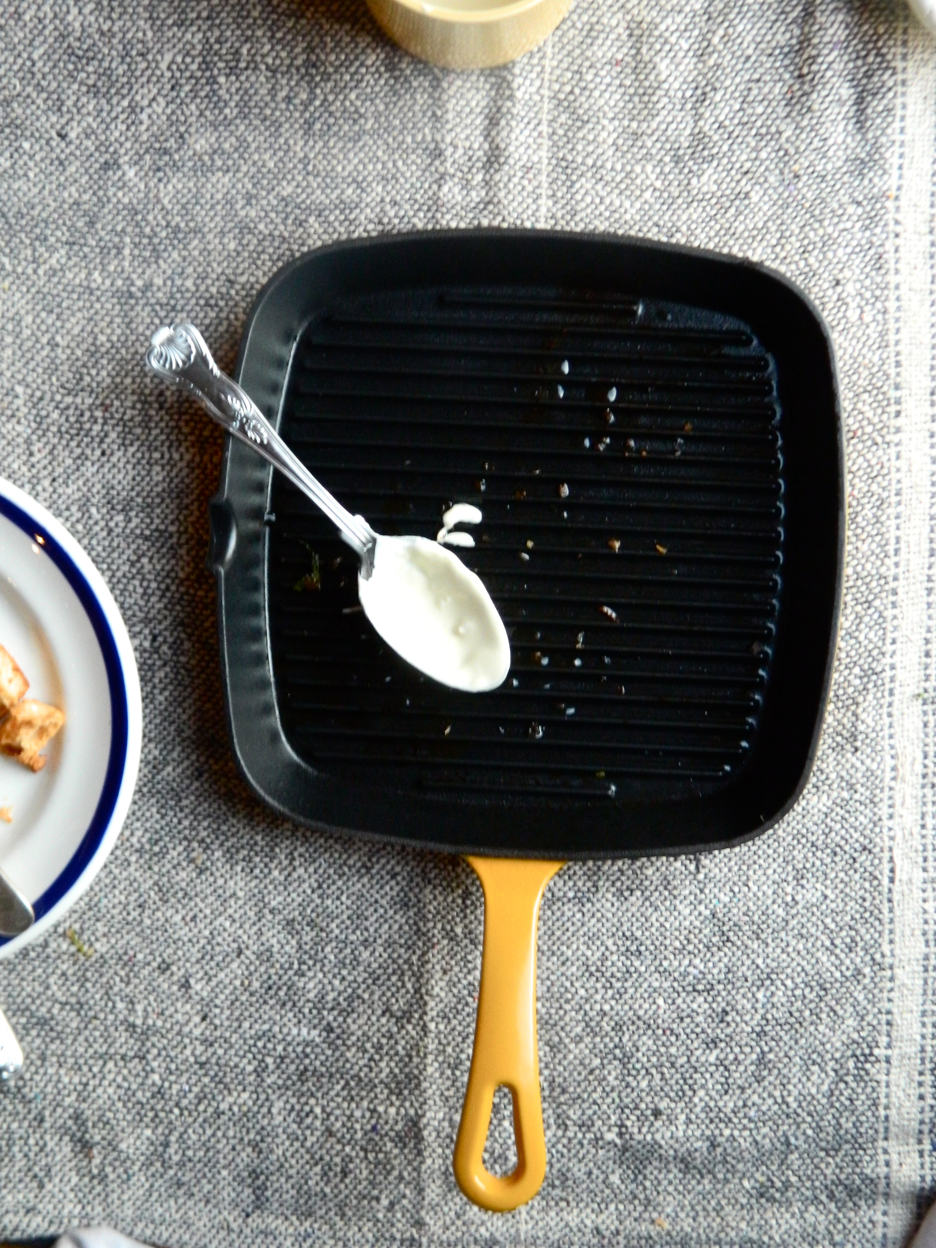 Cut the Cos lettuces in half, brush with olive oil and salt and start grilling on a hot skillet. Don’t move it until it has wilted and has nice char marks. Start the bread cubes – rub with a halved garlic clove, toss in olive oil and salt and bake in a hot oven. Make the dressing by whipping all the ingredients together. Add some buttermilk if you want it to be a little slacker. Then put it all together however you like and open that bottle of wine.