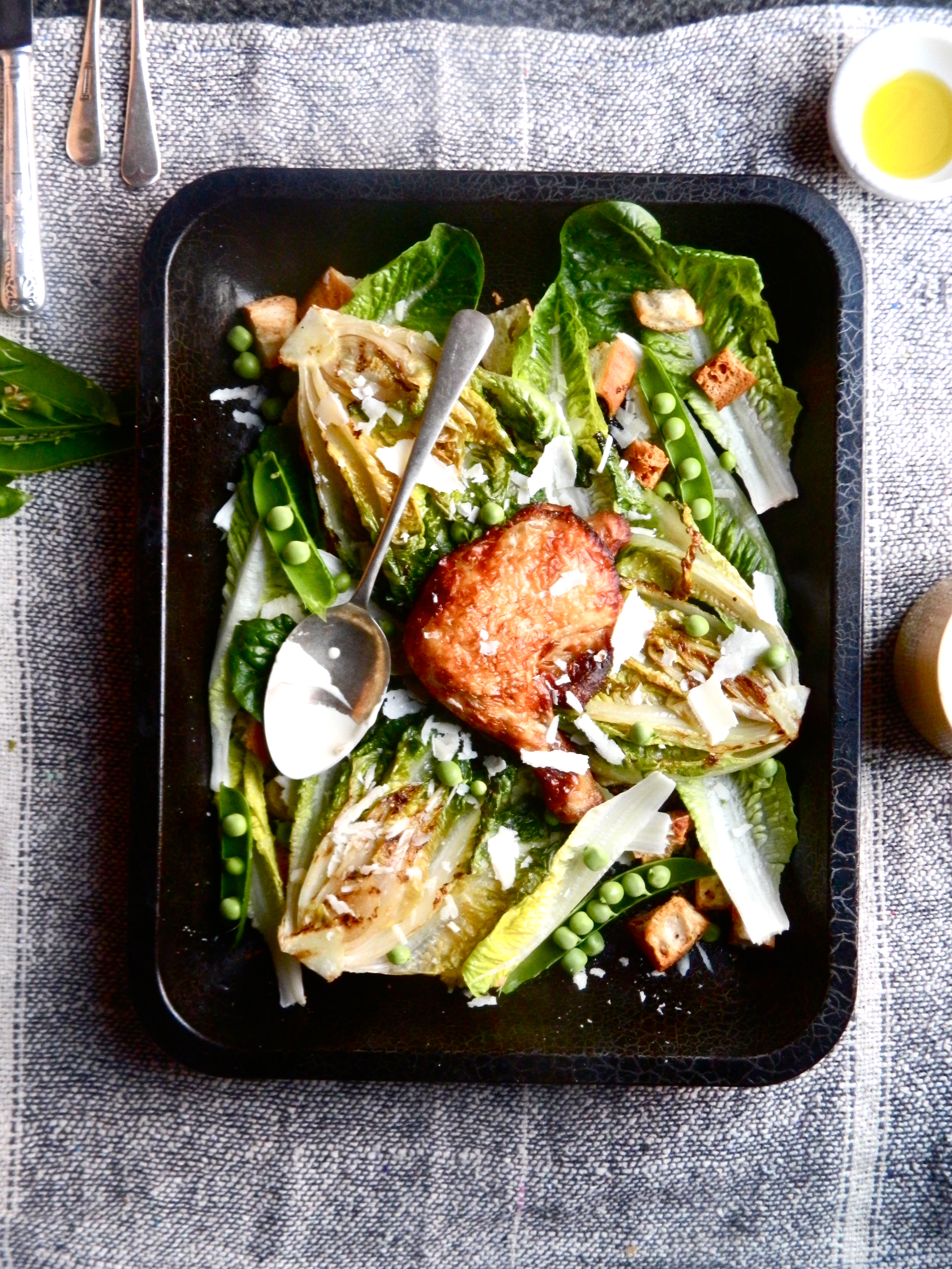 I decided to make a sharing-style Caesar salad the other day that would incorporate some of these new elements without straying too far from the original. To make it, I grilled the Cos lettuces for longer than I thought I should (on Diana’s advice), cut side down, leaving them till they wilted first, then caramelised slightly, then relented completely. I put out fresh crisp Cos leaves too; along with crunchy sourdough cubes, cooked in olive oil and salt; sweet garden peas; roast chicken and parmesan shavings, and served it all with a sour cream, anchovy, lemon juice, garlic and olive oil Caesar dressing. It was so good that I opened a bottle of wine to have with it.