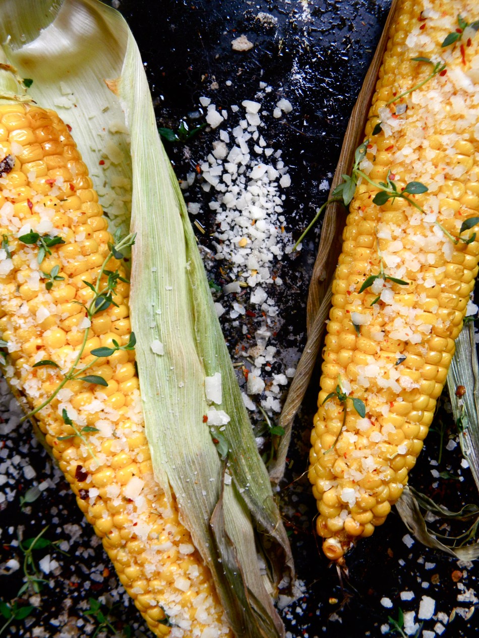 Grill the sweetcorn in their husks for about 15 minutes, then pull off all the leaves. Melt the butter and brush over the top of the sweetcorn, add salt, black pepper and the lime juice and return to the grill for a few minutes. Then simply serve hot with a generous scattering of grated parmesan, chili flakes, fresh coriander and sprigs of thyme. Note: if the BBQ has gone into the shed for the winter, this method also works in the oven.