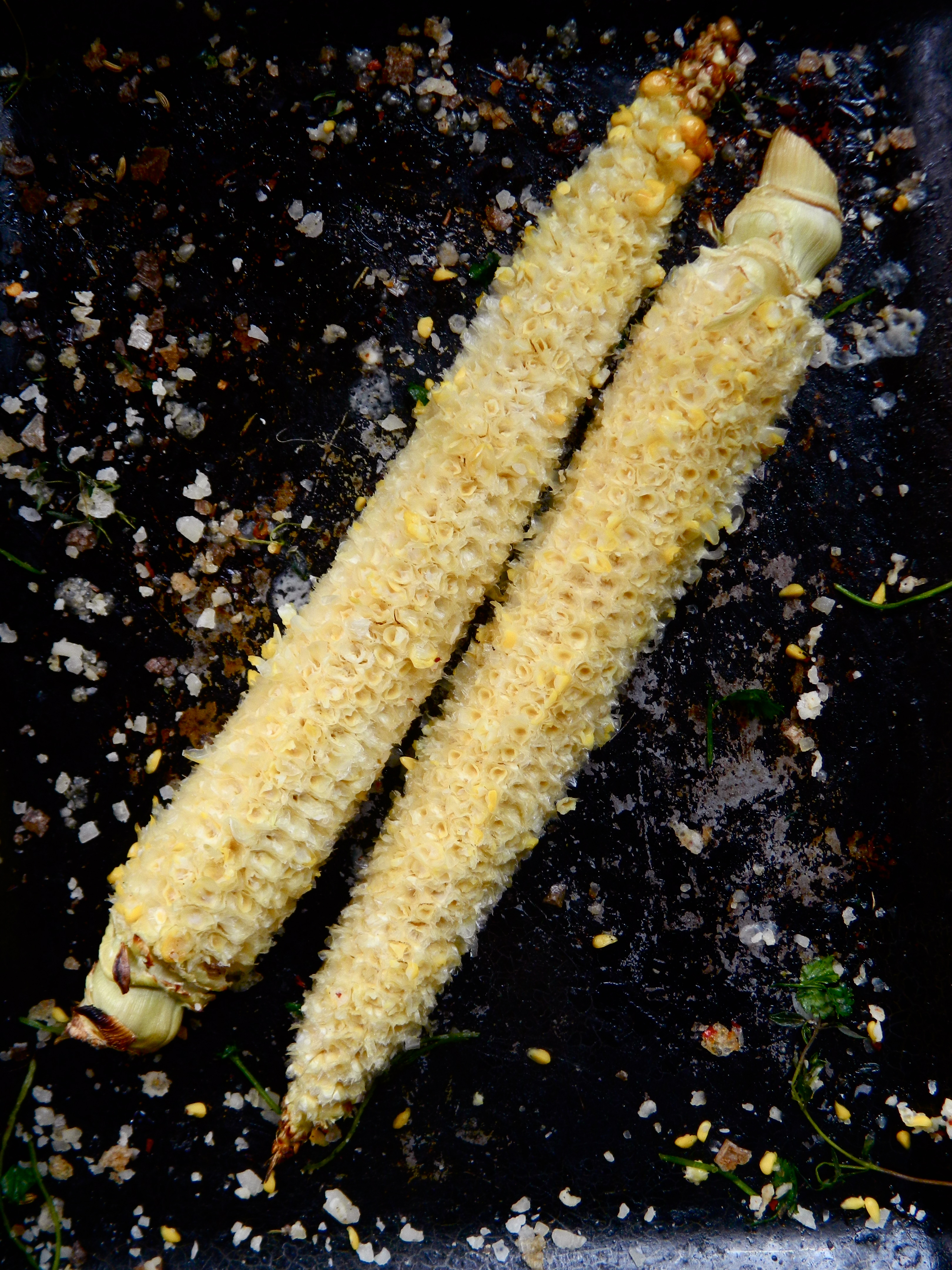 Grill the sweetcorn in their husks for about 15 minutes, then pull off all the leaves. Melt the butter and brush over the top of the sweetcorn, add salt, black pepper and the lime juice and return to the grill for a few minutes. Then simply serve hot with a generous scattering of grated parmesan, chili flakes, fresh coriander and sprigs of thyme. Note: if the BBQ has gone into the shed for the winter, this method also works in the oven.