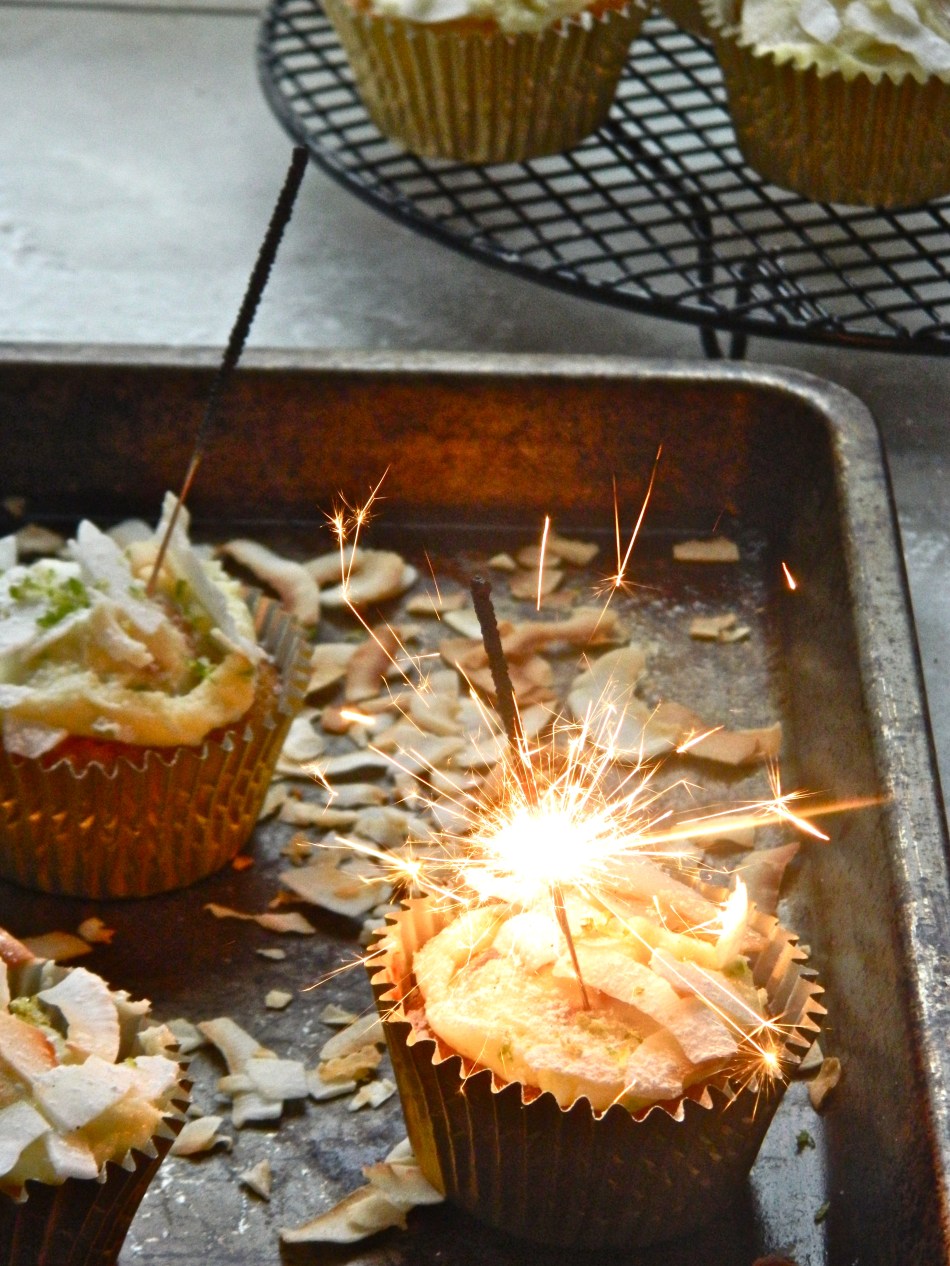 For the icing, mix the butter with the icing sugar and coconut cream (you’re looking for the thicker stuff in the container rather than the liquid). Add the lime zest, saving a little to garnish the top of the buns. Toast half of the coconut in the oven for a few minutes and mix with the remaining shards, crumble slightly and set aside. When the buns have cooled, spread about a teaspoon of the icing over each with a knife. Dunk them into the coconut shards and add a small pinch of lime zest to each before serving. Add sparklers for extra summer fun.
