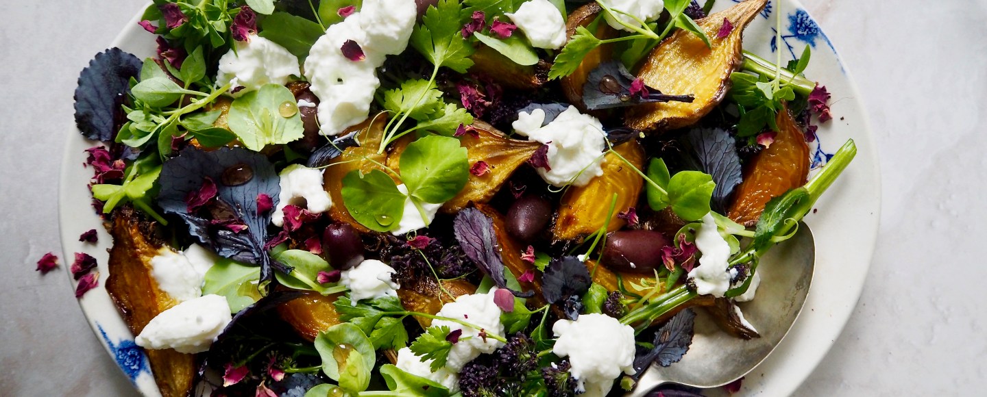 ROAST GOLDEN BEETROOT & PURPLE SPROUTING BROCCOLI WITH SHEEP’S CURD