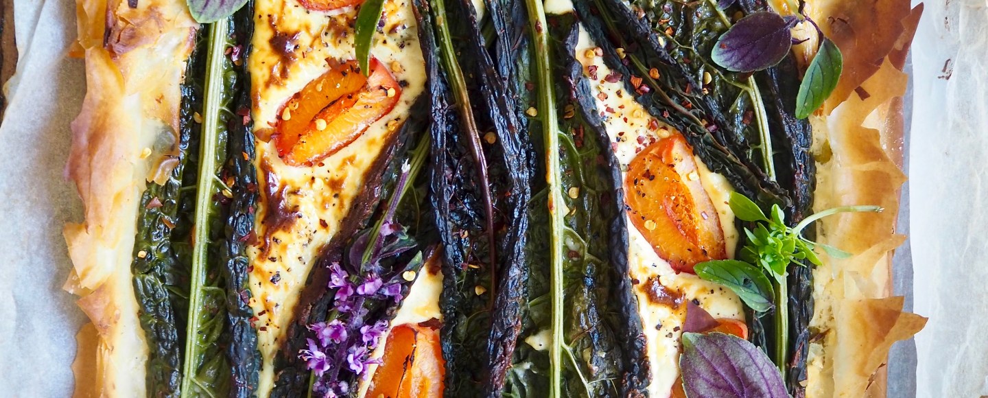 Despite its striking appearance, this tart is actually fairly quick and easy to make. It involves a light pastry base rather than shortcrust (either bought filo or puff; puff is easier but filo is more impressive); a simple topping that you just mix together and spread on, and then whatever veg additions you fancy. I combined cavolo nero with apricots for mine, but it would work beautifully with asparagus and baby broad beans too, for example.