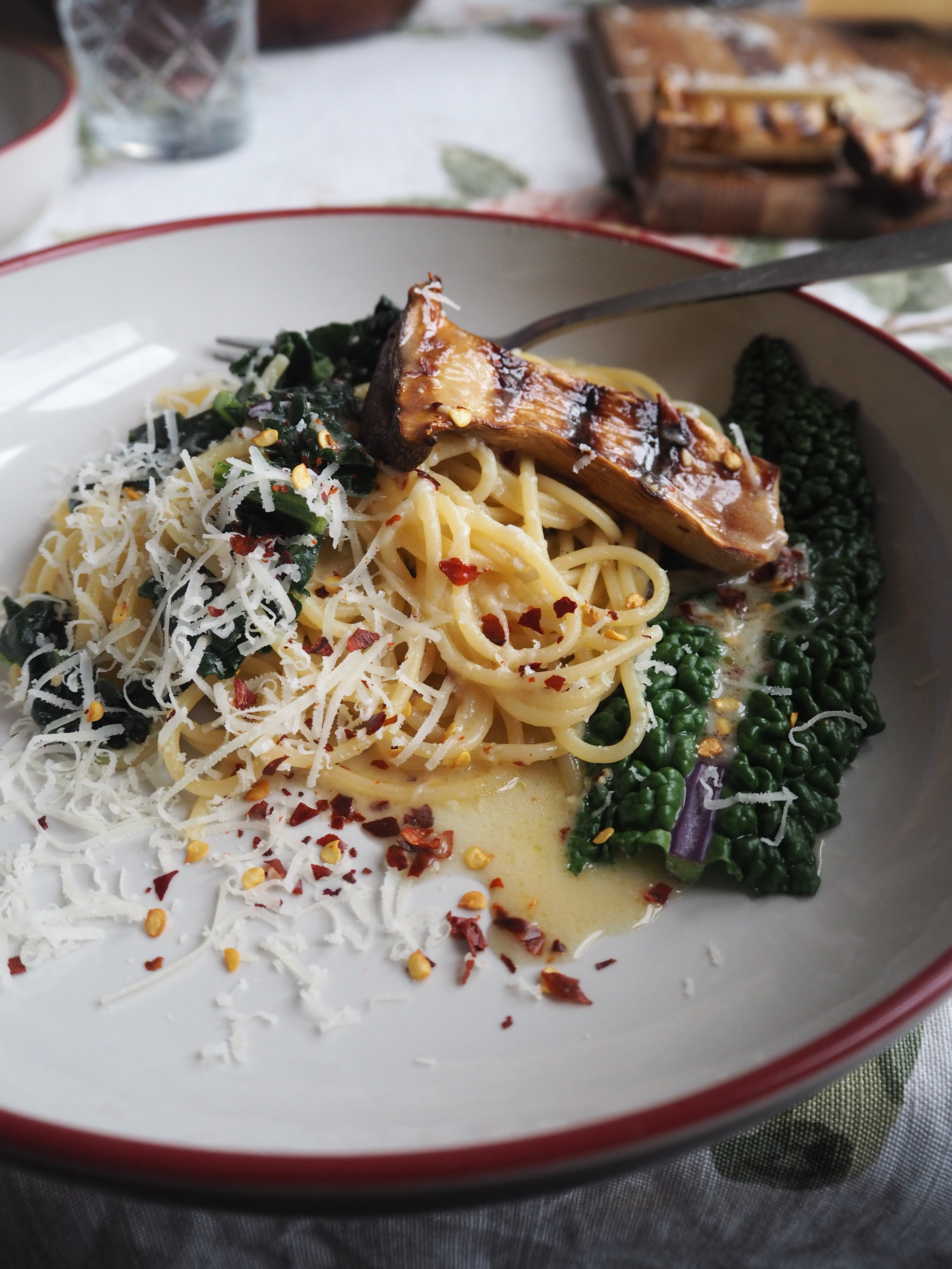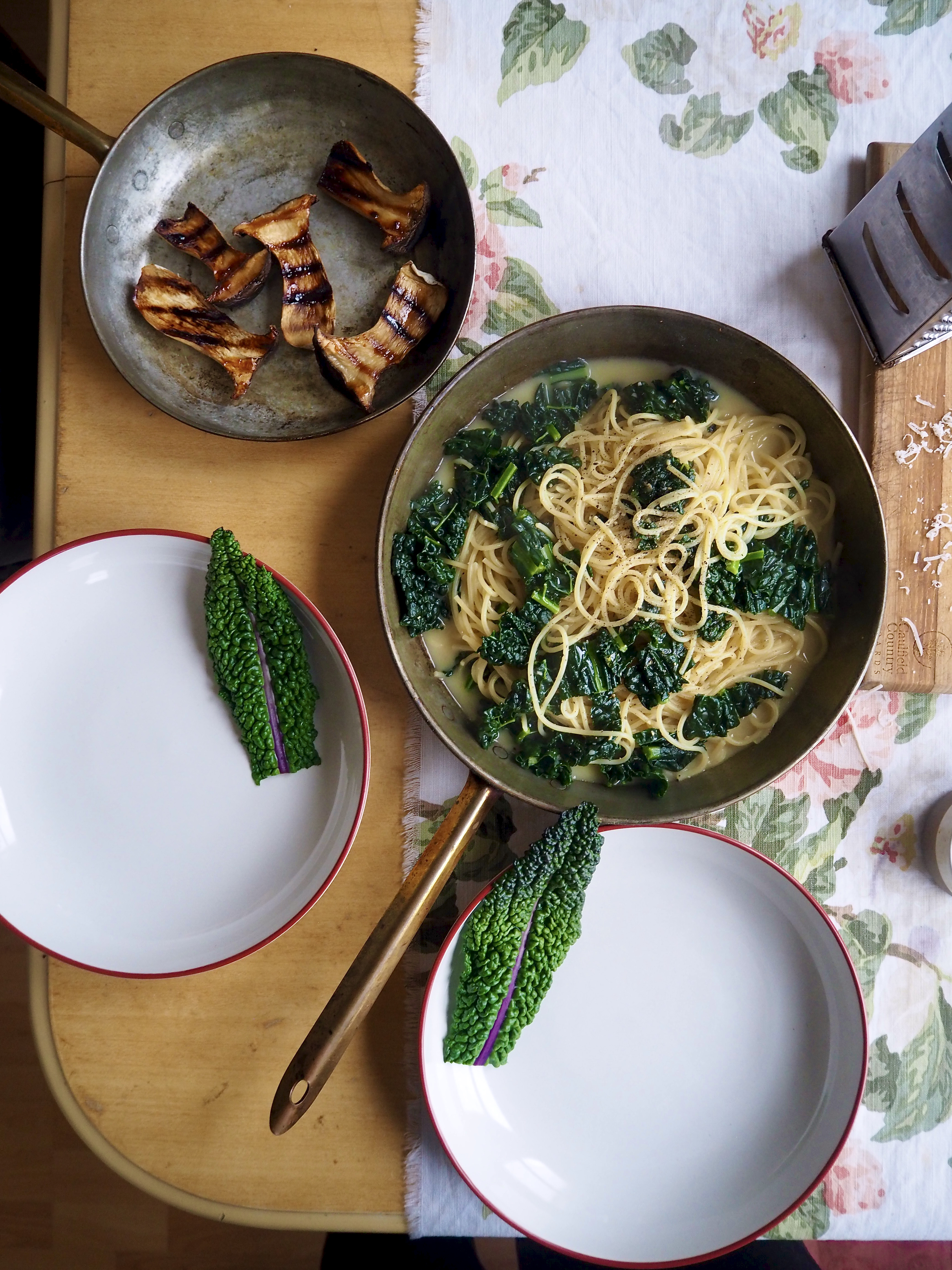 Boil the spaghetti in a large pot of salted water. Halfway through add the kale if you’re using it. When the pasta is just about cooked, remove a cup of pasta cooking water and set aside. Drain the spaghetti, then return to the pot along with the butter, grated parmesan, spoon of miso, black pepper and a good slosh of the reserved pasta water. Stir vigorously, continuing to cook over a low heat, till the cheese has emulsified with the pasta water into a creamy sauce – it will eventually, keep going! Add more reserved pasta water if needed, you want the consistency to be quite loose, slippery and sloshy!
